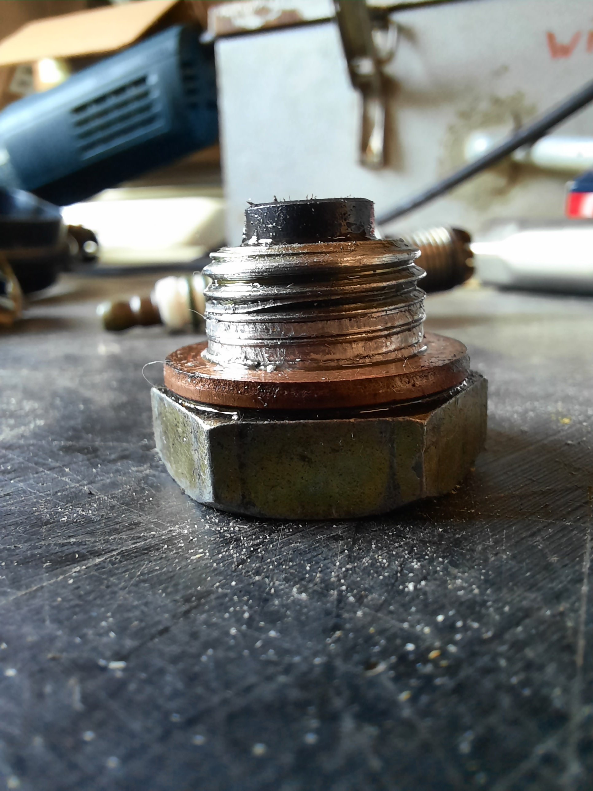 Beim eindrehen war´s dann vorbei. Ist auch eine Magnetschraube weshalb ich nun als erstes mit einem Standardstopfen in 16 x 1,5 mm (muss ich noch besorgen) versuchen würde den Käse wieder dicht zu kriegen. Teflonband vielleicht nehmen? Hab wahrscheinlich nicht sooo viele Versuche mehr :-)