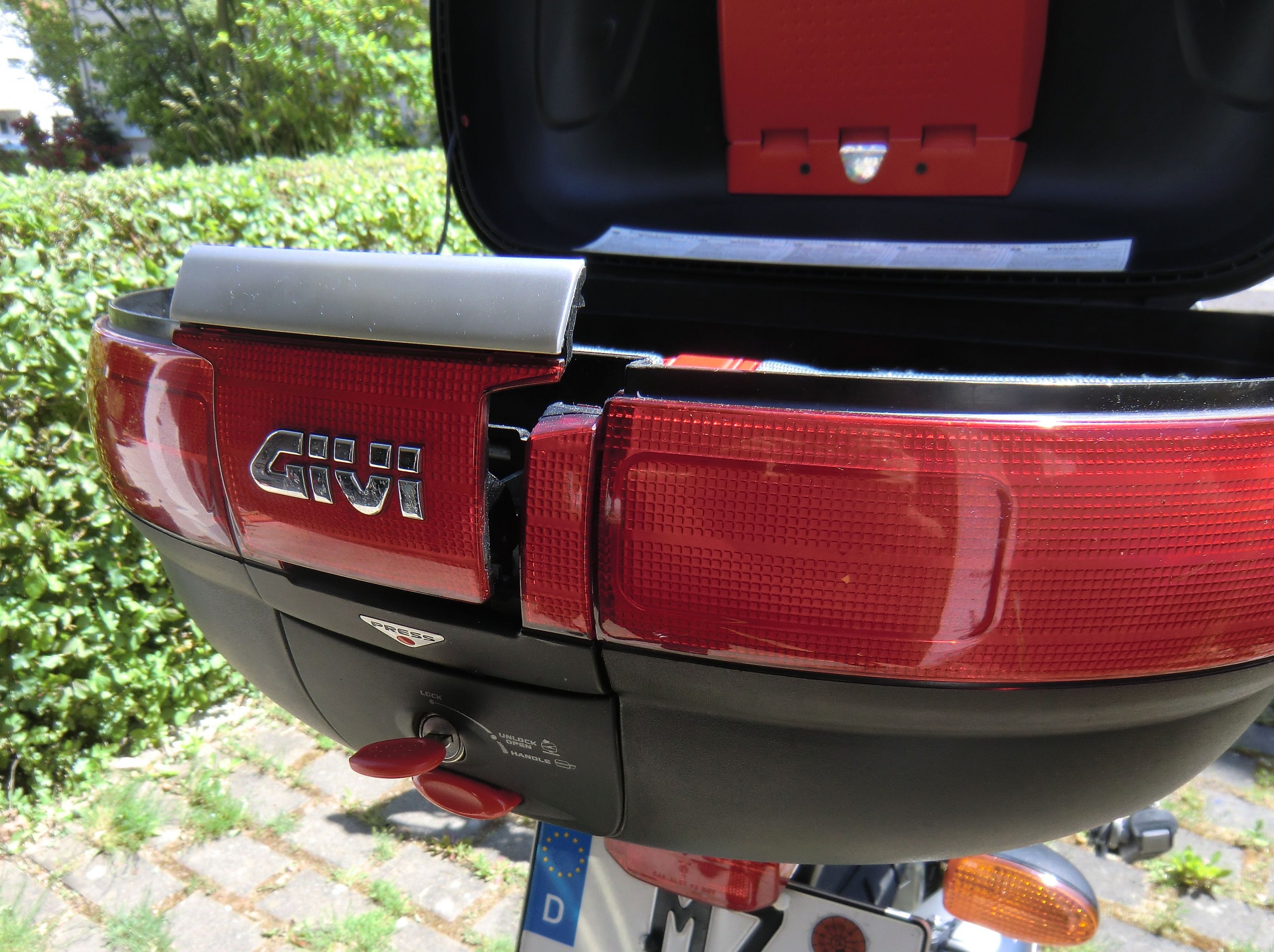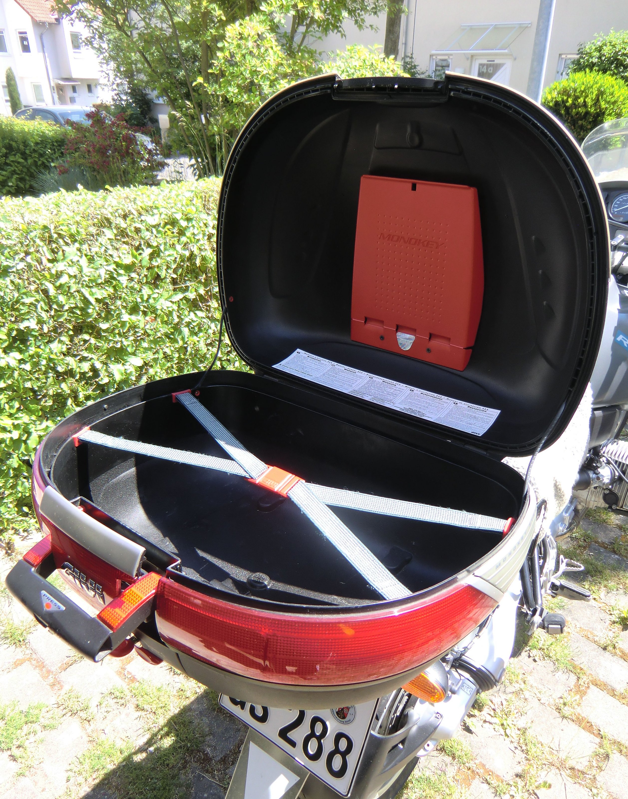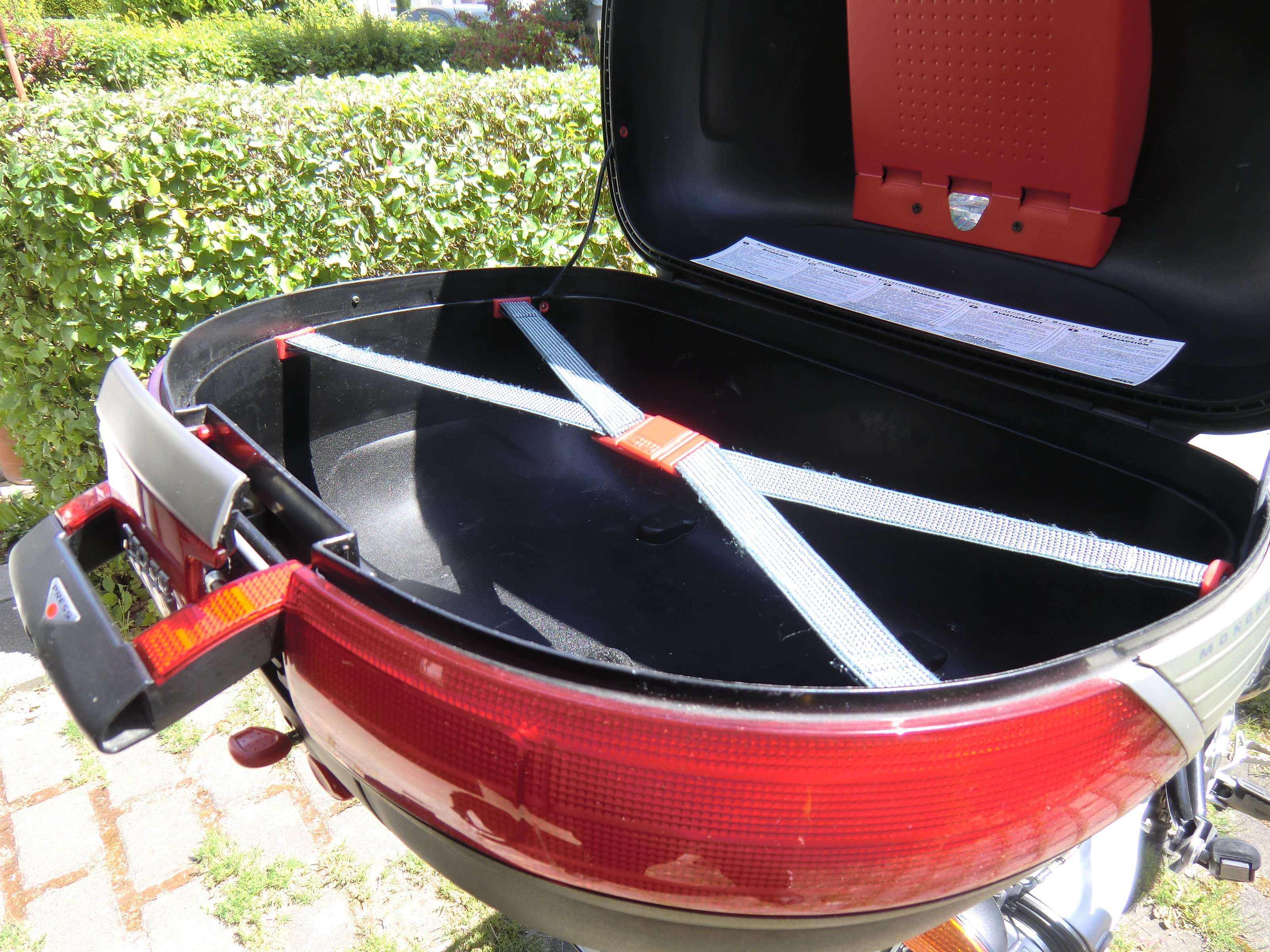 Groß genug für 2 Helme und/oder jede Menge andere Dinge. Ideal für die kleine Tour, aber auch zusätzlich zu Koffern, wenn es auf große Tour geht. Die Gummis sind nicht ausgeleiert, Schloss und Scharniere funktionieren einwandfrei, das Topcase ist wasserdicht. Natürlich hat das Topcase relativ geringe Gebrauchsspuren, es ist ja nicht neu!