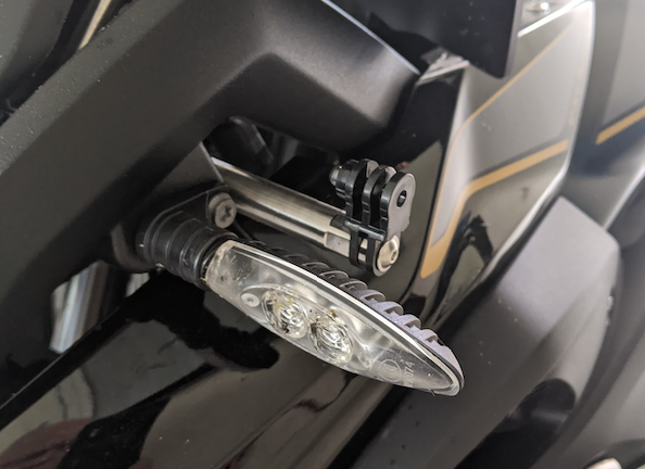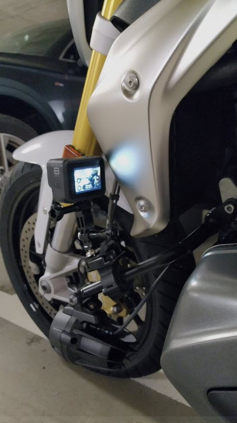Ich verwende verschiedene RAM Befestigungen. Meist mit der RAM Tough Claw, von denen habe ich vier oder fünf für verschiedenste Anwendungen, nicht nur GoPro. Weiterhin habe ich noch einen RAM Ball an der Blinker-Schraube, aber das ist etwas suboptimal, weil die ganze Konstruktion recht schwer wird und die Aufnahme dafür einfach nicht gedacht ist. Ich verwende meist die Motorschutzbügel oder meine Kofferträger als Träger.