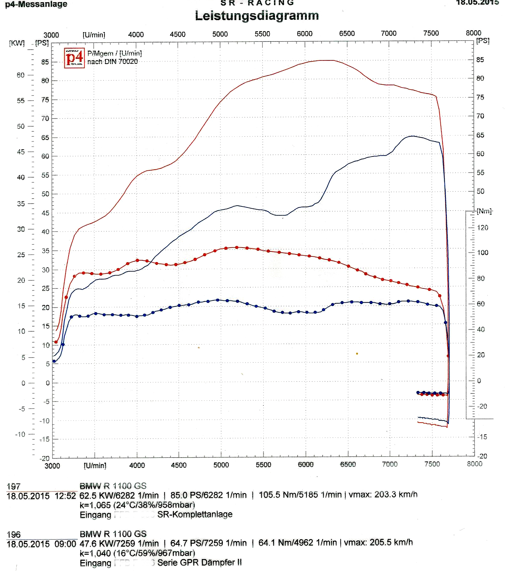 Der Korrektheit halber müsste man natürlich gegen eine Originalauspuffanlage messen, aber zumindest ist die Messline von der GPR Tröte mal da.