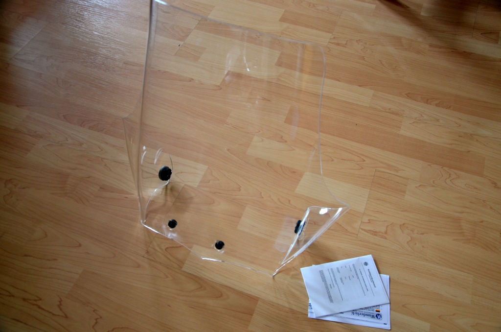 Die Scheibe hat auf meiner GS ca. 6000 km gedient und hat vorn (siehe Foto) eine kleine Delle vom Reiben an einer Schraube (Größe nur wenige mm). Desweiteren sind minimale Kratzerchen auf der Scheibe zu erkennen, wenn man sie gegen das Sonnenlicht hält.
