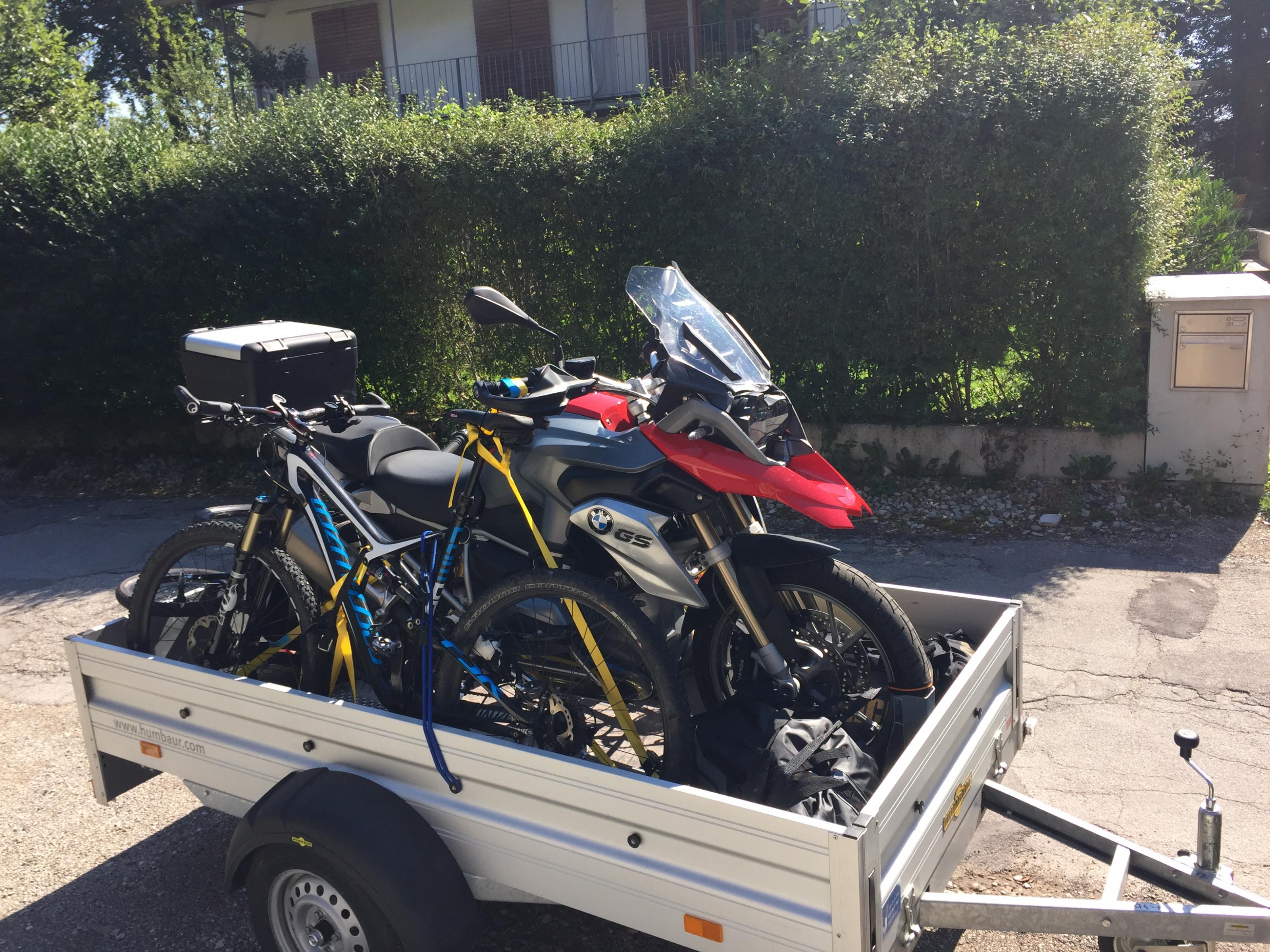 Für den Transport der GS haben wir uns einen Plattformanhänger gekauft, auf welchem vorne eine Motorradwippe installiert ist. Vorne lege ich jeweils eine Zurrschlaufe um die Gabelholme (oberhalb der unteren Gabelbrücke) und gehe dann mit jeweils einem Zurrgurt an die Zurrschlaufen. Dadurch kann das Motorrad weiterhin normal federn und ich muss den Telelever nicht in die Feder ziehen.