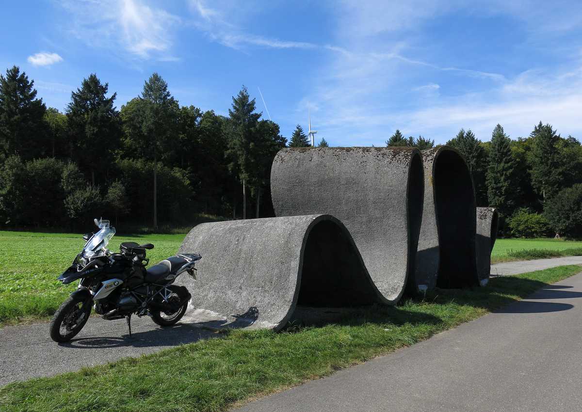 Mensch, mach den Rain-Modus wieder reinIch hätte da noch ein Kunstwerk als Kulisse zu bieten, Petras GS vor der Asphaltwelle bei Ravenstein im südlichen Odenwald.