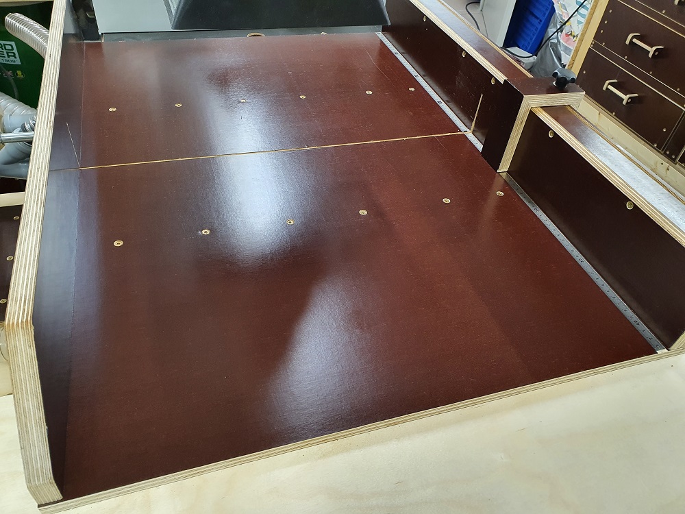 Wieder die Ansicht von hinten, aber in jetzt geschlossenem Zustand, die Siebdruckplatte habe ich ganz genau geschnitten / geschliffen in der Höhe, sie sitzt jetzt ohne eine Befestigung und ist innerhalb von 5 Sekunden weg zum Spindel wechseln. :rocker: