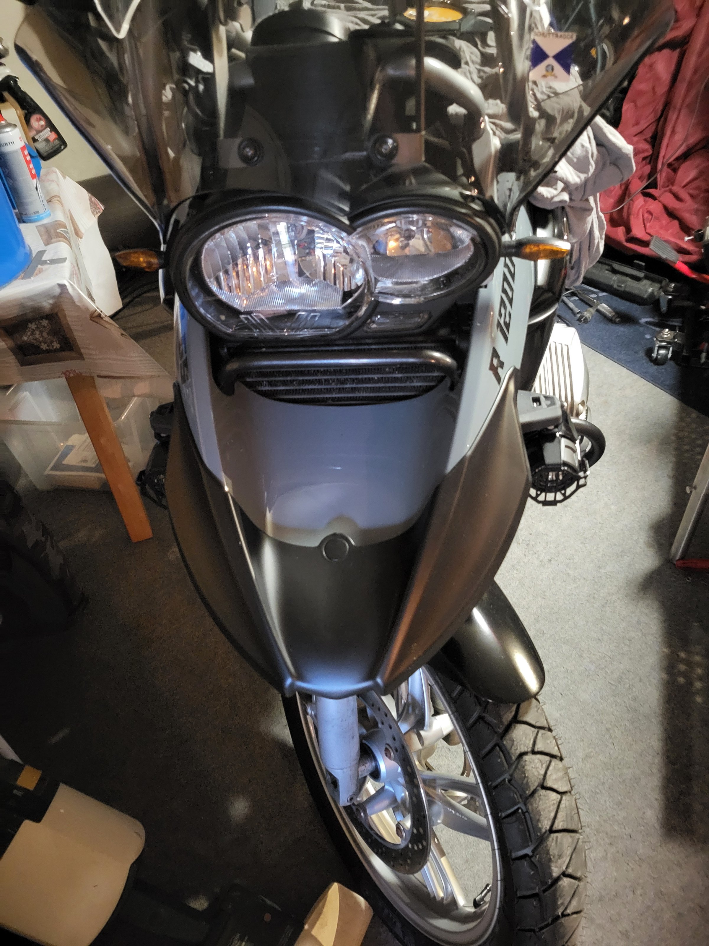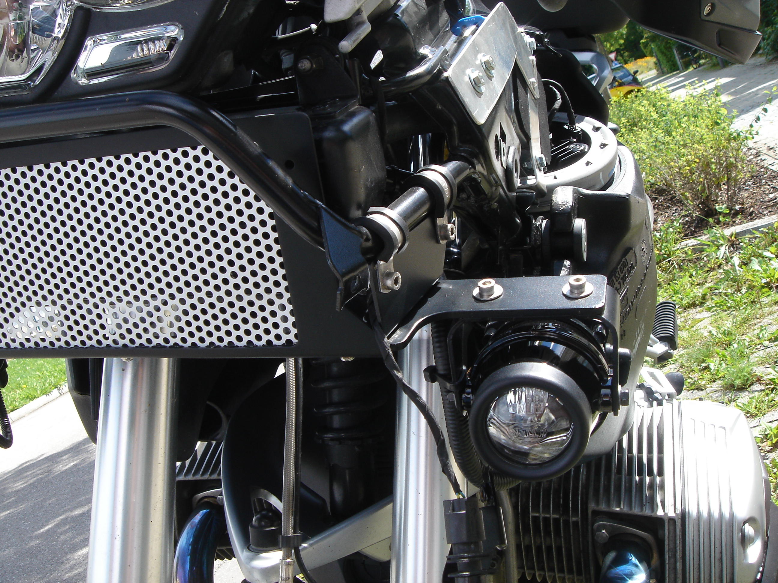 Ein Halter für beide Scheinwerfer (bei mir von Hella, siehe Bild), damit sind beide Scheinwerfer leicht auszurichten. War bei meiner GS einfach zu montieren.