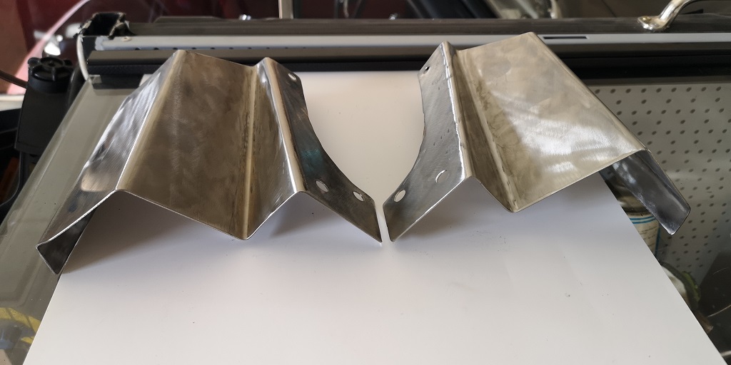 Diese Schablone ausgeschnitten und auf ein 1,5mm Edelstahlblech übertragen, das Blech zugeschnitten, Löcher für di Befestigung gebohrt und mit Hilfe von Abkantbacken am Schraubstock das Blech in Form gebracht.