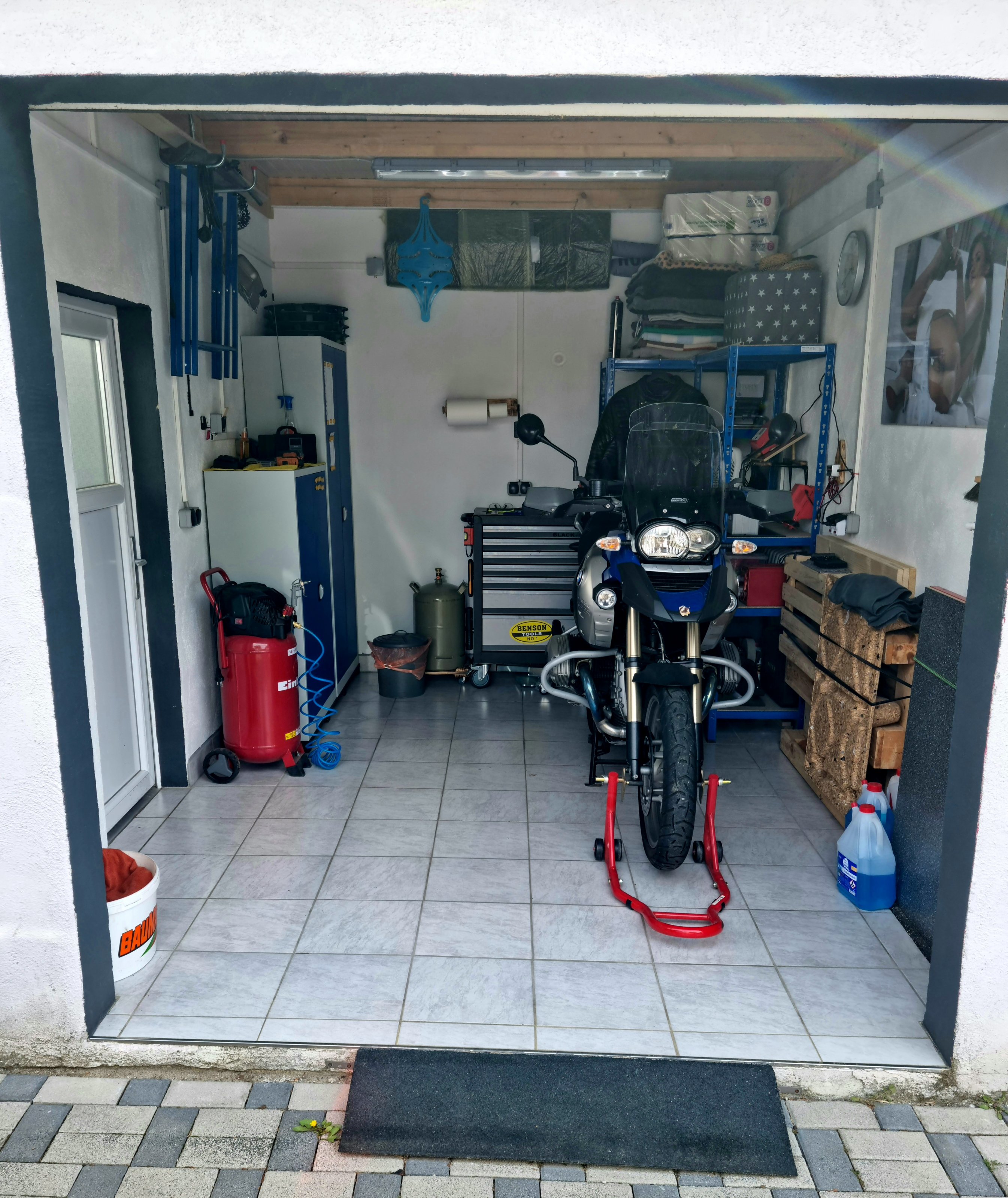 Da ich den Platz normalerweise fürs Motorrad brauche muss die Hebebühne wenn sie nicht gebraucht wird an die Wand.