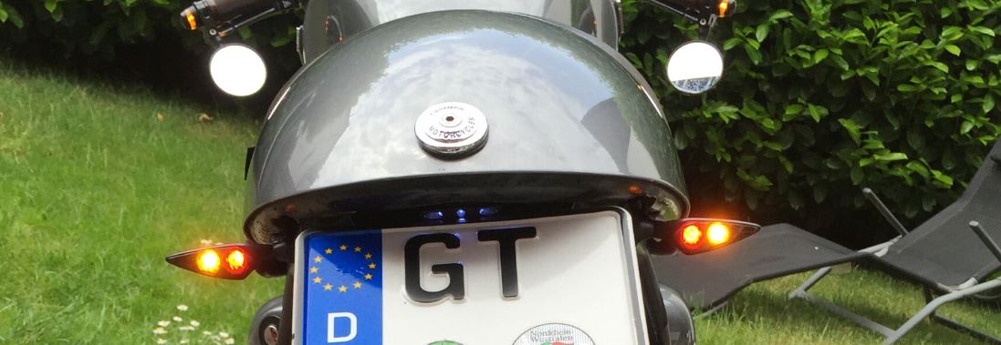 Stimmt , der Halter passt noch. Nicht so ganz. Aber das werde ich noch ändern. Blinker und Rücklicht sind Kellermann Atto. Sogar mit EG Nummer.Ein noch kleineres Nummerschild? Das Schild ist ja jetzt schon zu klein für den Halter. Der Halter steht ja rechts und links über!