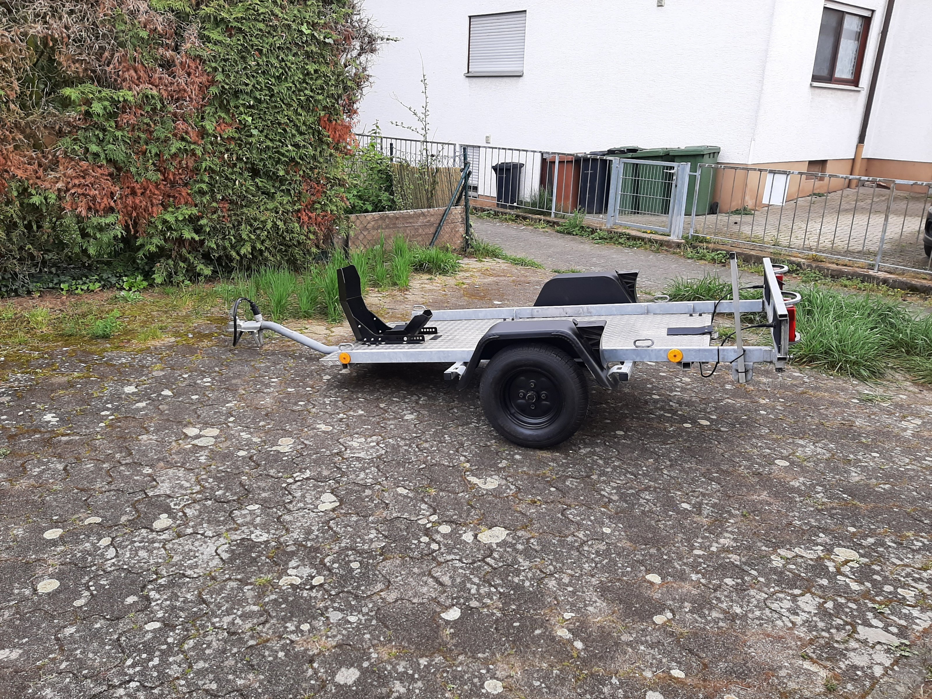 Restauriert wurde er 2017, mit einer Riffelblech-Aluplatte (210 €) und Motorradwippe, neue Rückleuchten vor 3 Jahren, neu verkabelt am 26.04.2022