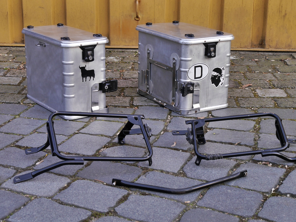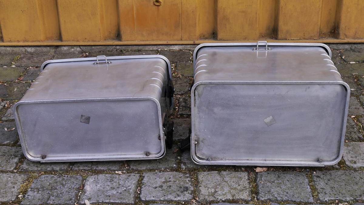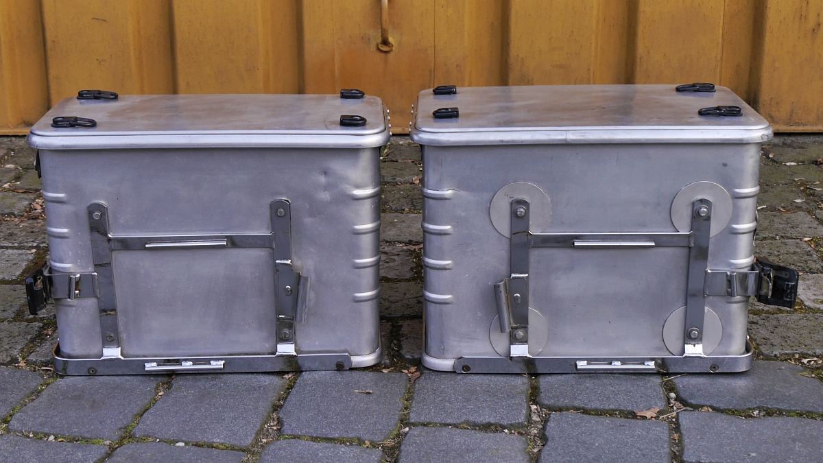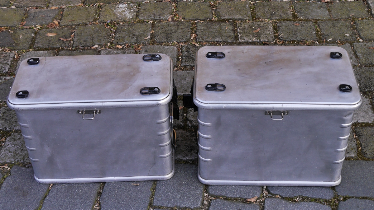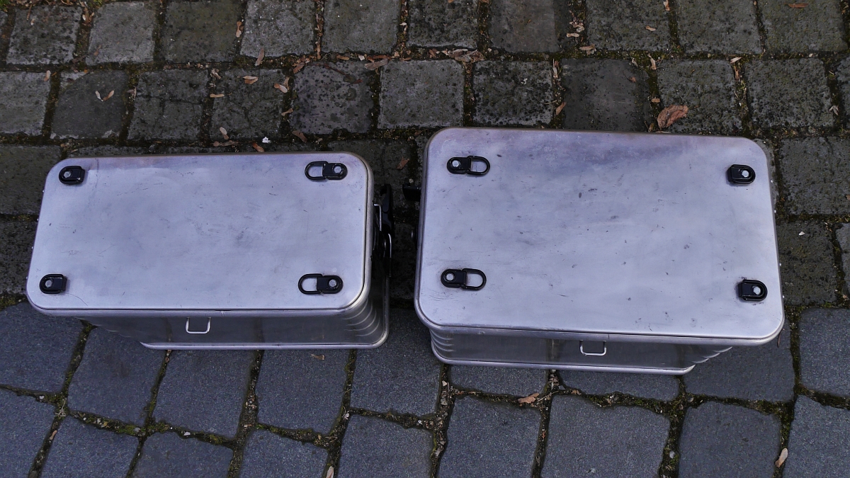 Innen sind sie mit hellblauem Kunststoff (gegen Alu-Abrieb) ausgeschlagen. Es handelt sich um ein unsymmetrisches System mit 38 & 45 l Volumen. Die rechte große Box habe ich an allen 4 Aufhängepunkten mit runden Alublechen verstärkt.