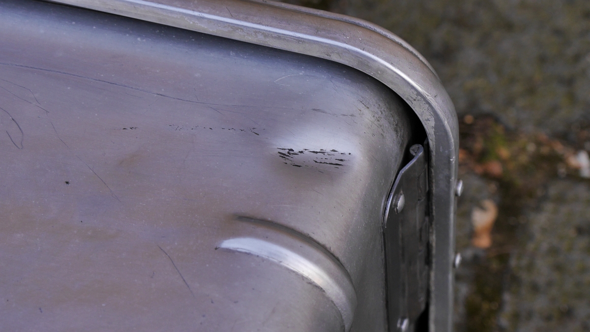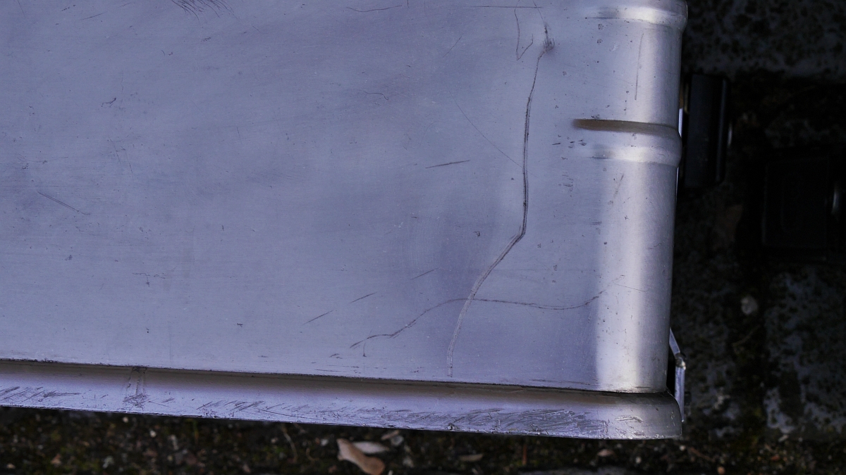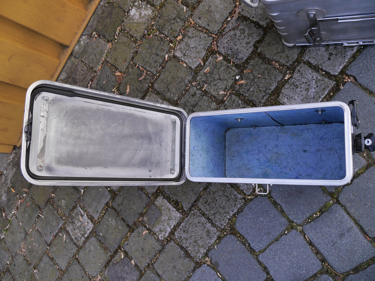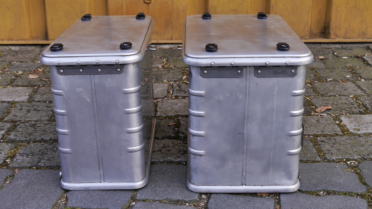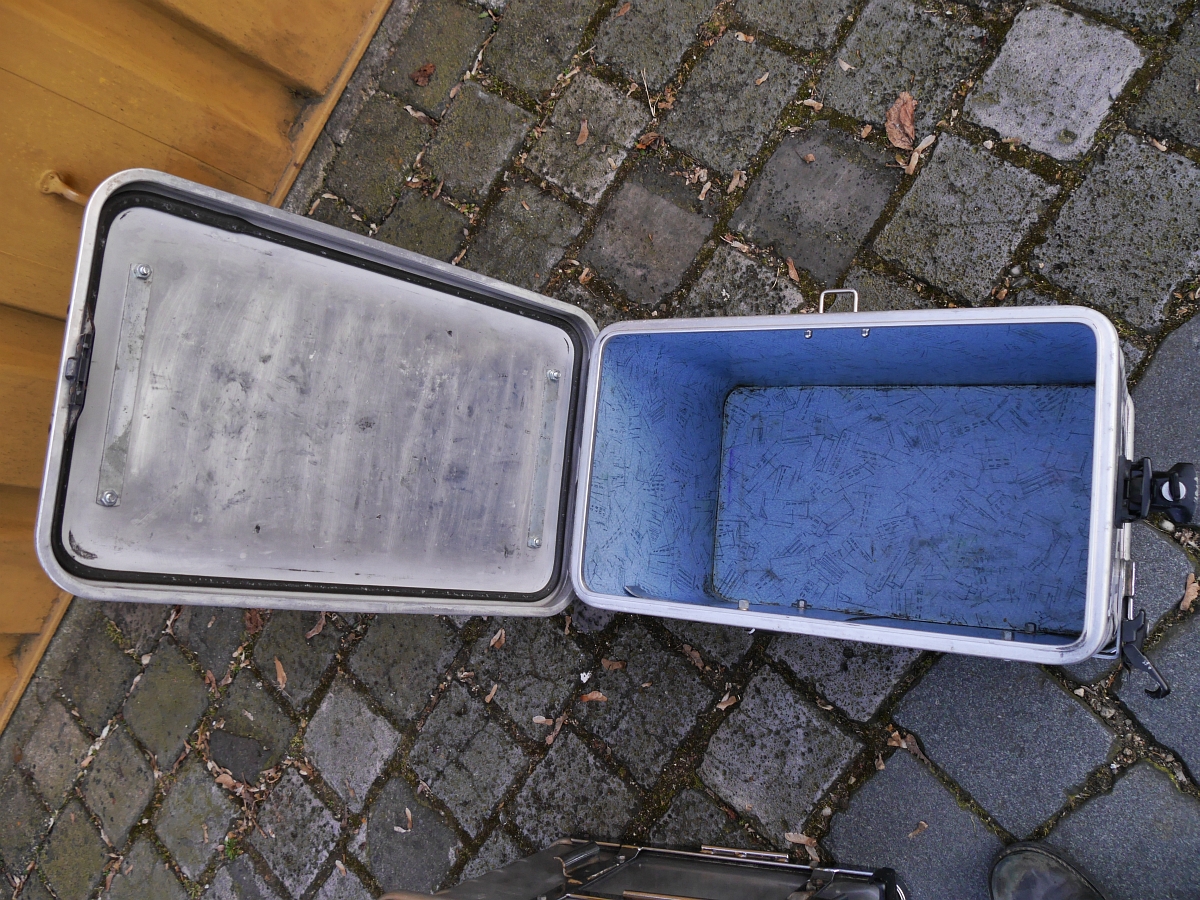 Innen sind sie mit hellblauem Kunststoff (gegen Alu-Abrieb) ausgeschlagen. Es handelt sich um ein unsymmetrisches System mit 38 & 45 l Volumen. Die rechte große Box habe ich an allen 4 Aufhängepunkten mit runden Alublechen verstärkt.