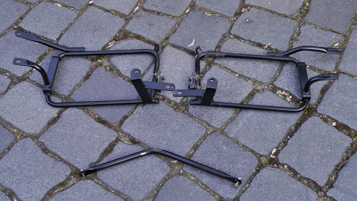 Den Träger habe ich vor 2 Jahren neu mit Kunststoff beschichten lassen (schwarz). Er hat jedoch schon wieder ein paar Abriebstellen (nix dramatisches). Der Verbindungsbügel zwischen den Trägern (hinten) ist vom Abgas etwas schwarz-matt verfärbt.