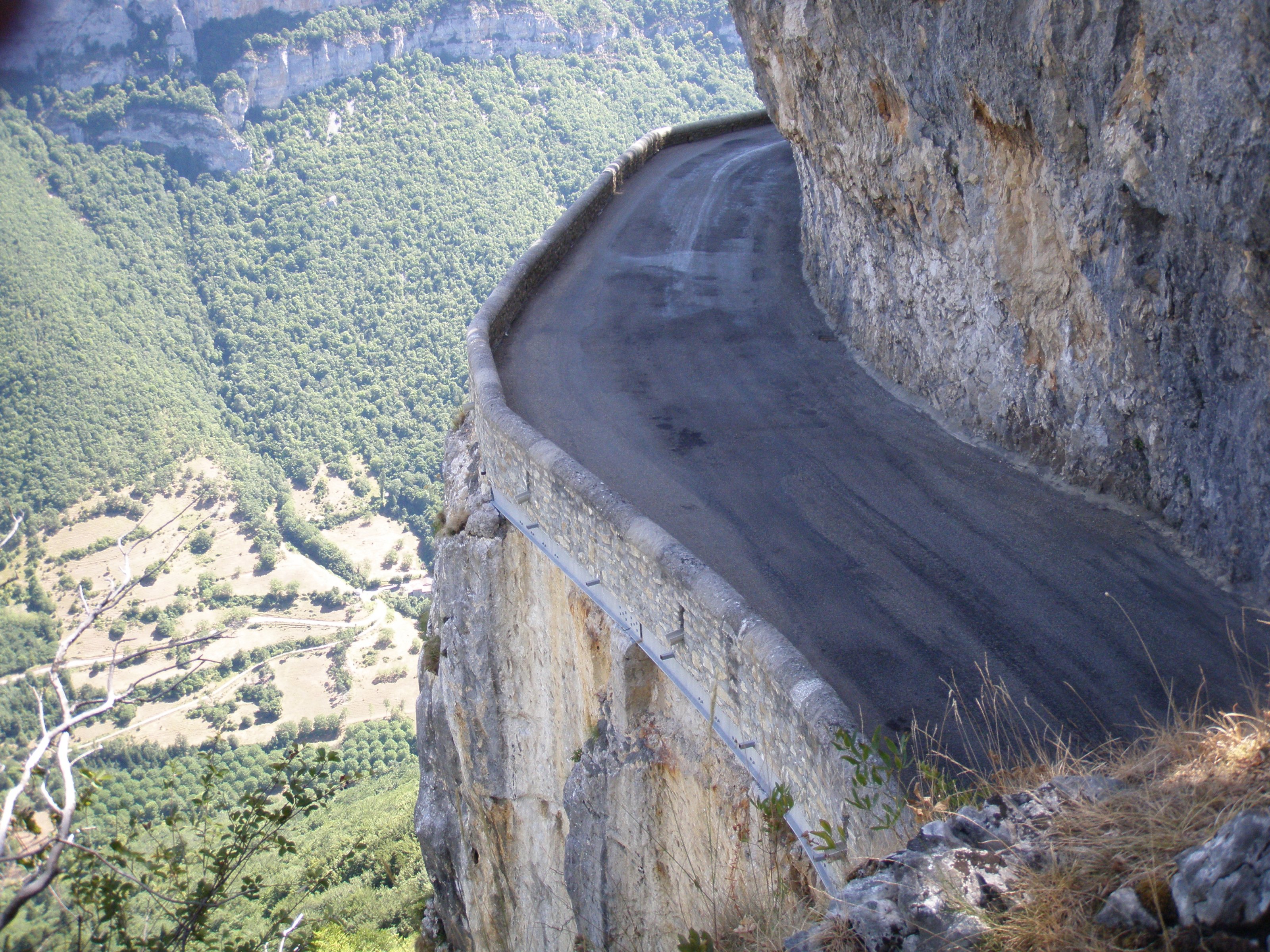 Wenn Du in Gegenrichtung zum Photo direkt an der Mauer lang fährst, weil Dir ein Auto entgegen kommt, siehst Du schon etwas vom hinter der Mauer lauernden Abgrund. Ist auf anderen Straßen aber nicht viel anders, auch z.B. in den Gorges du Tarn hat man nur ein niedriges Mäuerchen neben sich, auf der Assietta und vielen anderen Straßen nichtmal das ;).