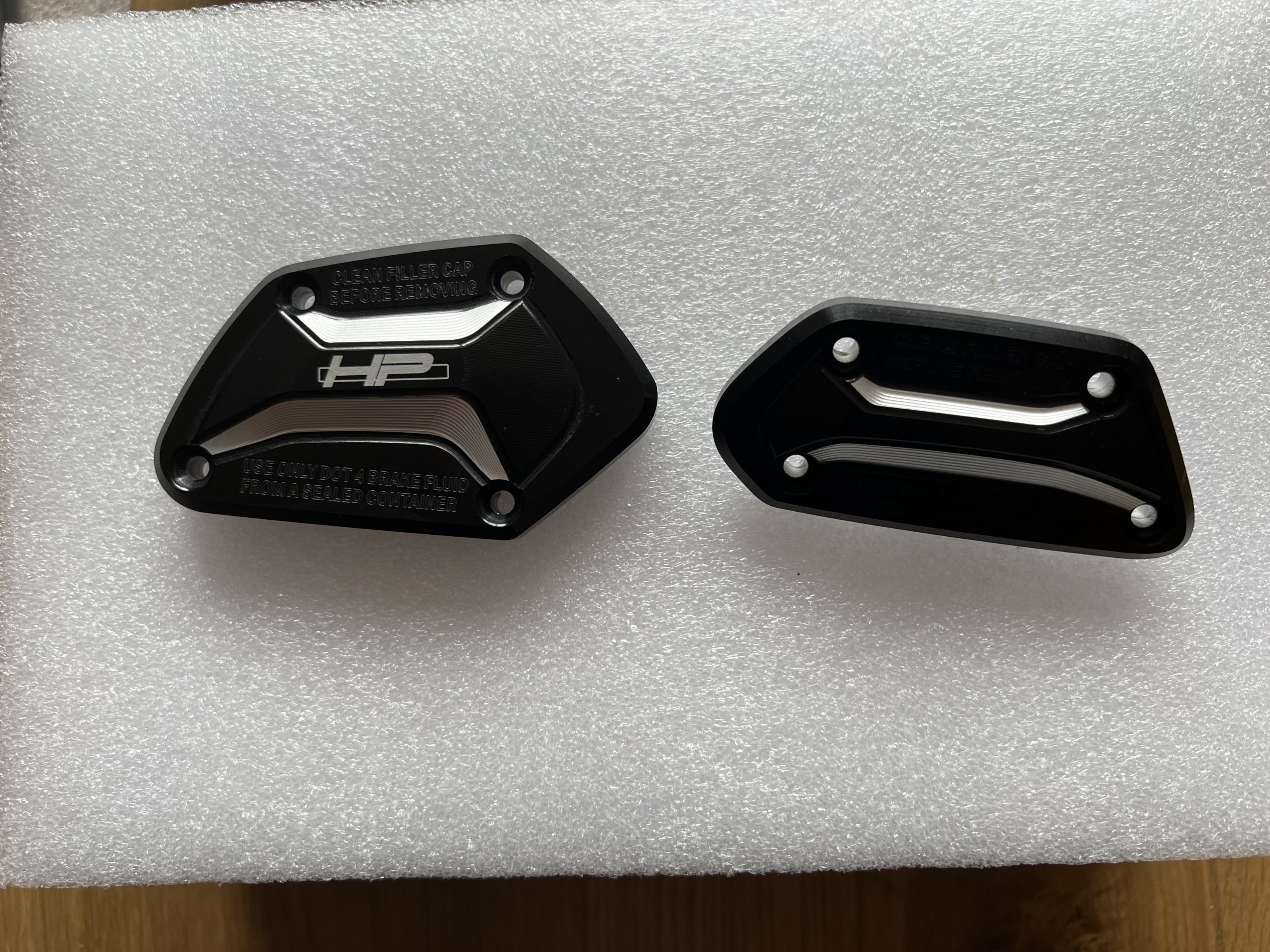 angeboten wird ein Satz Hp Abdeckungen für die Ausgleichsbehälter (Brems- und Kupplungsflüssigkeit)