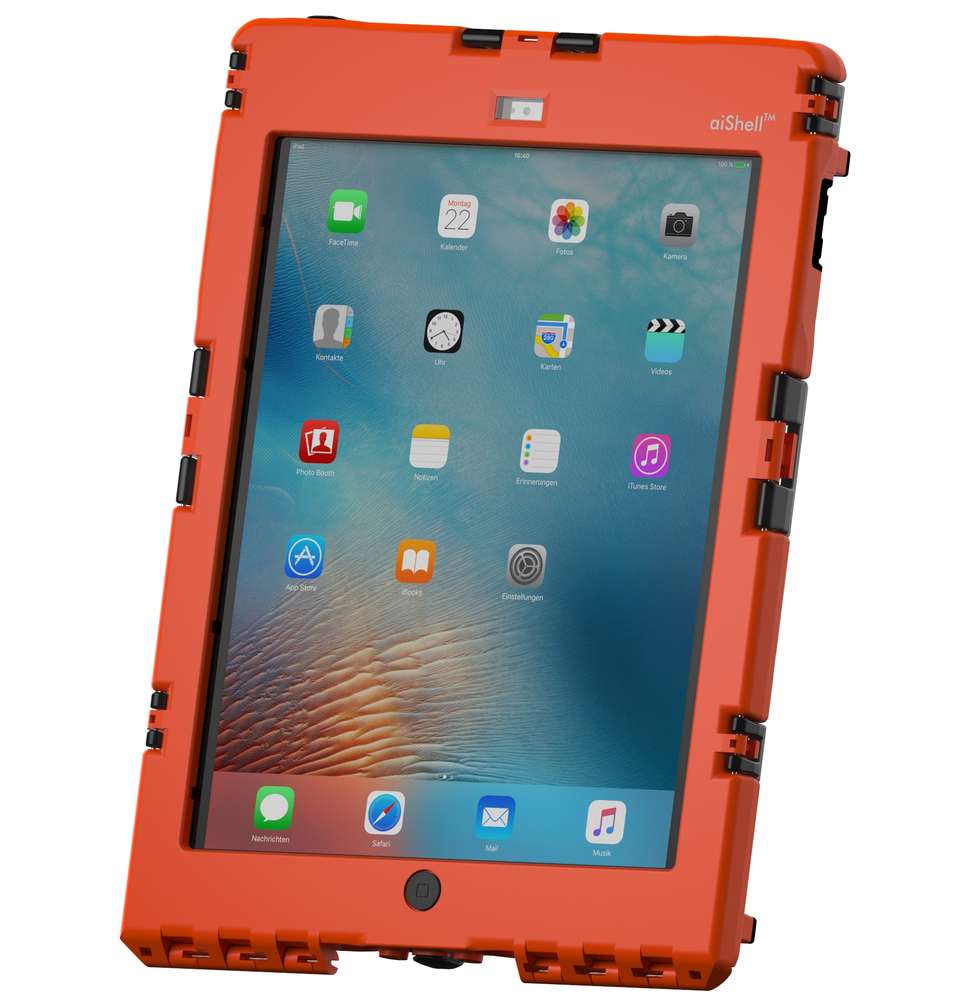 Bei den aiShell™ Gehäusen für die iPads von Apple handelt es sich um zuverlässige Industriegehäuse, die natürlich auch privat genutzt werden können. Sie sind wasserdicht und schlagfest. Nahezu alle Funktionen wie z.B. Buttons und Kameras lassen sich auch von außen nutzen. Als einziges Gehäusesystem ist sogar die Ladefunktion unter Wasser nutzbar. Dabei ist das iPad trotzdem innerhalb von Sekunden einzulegen und auch wieder zu entnehmen. Durch die ergonomisch geformte Rückseite liegt das Gehäuse viel sicherer in der Hand, als andere Produkte.