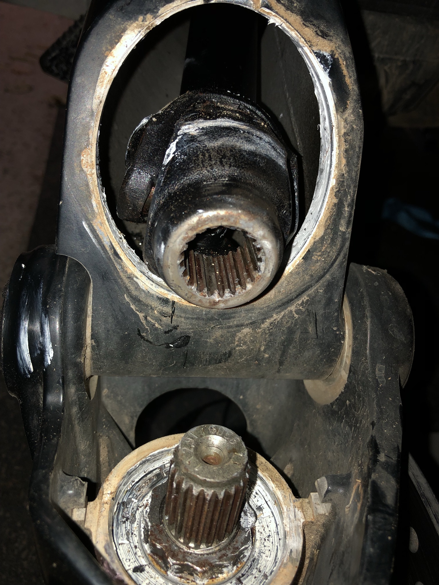 Die Kardanwelle lässt sich auch 3mm vor- und zurückschieben. Also vorne auch nicht festgegammelt. Evtl. ziehe ich die aber komplett und fette vorne auch neu. Übrigens war die Schraube der Haltestrebe nicht gesichert?