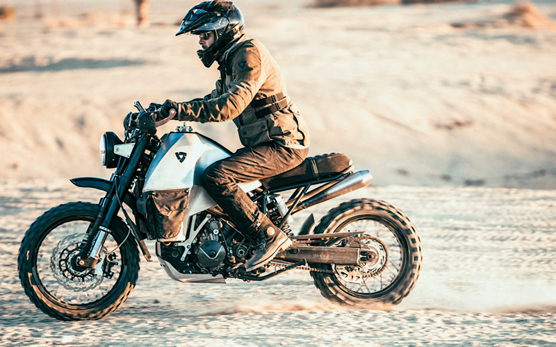 Wir überschreiten Grenzen, wenn es technisch möglich ist. Diesen Anspruch betonen wir mit einem ganz speziellen Motorrad, der REV’IT! #95. Dabei handelt es sich um eine zweiradgetriebene Abenteuerenduro, die auf der kultigen KTM 950 Super Enduro basiert. Ihr Aussehen mag polarisieren, aber sie liefert endlose Traktion und unglaubliche Reichweiten dank eines beneidenswerten Tankvolumens. Damit gelangt man immer an sein Ziel, egal welchen Punkt am Horizont man anvisiert.
