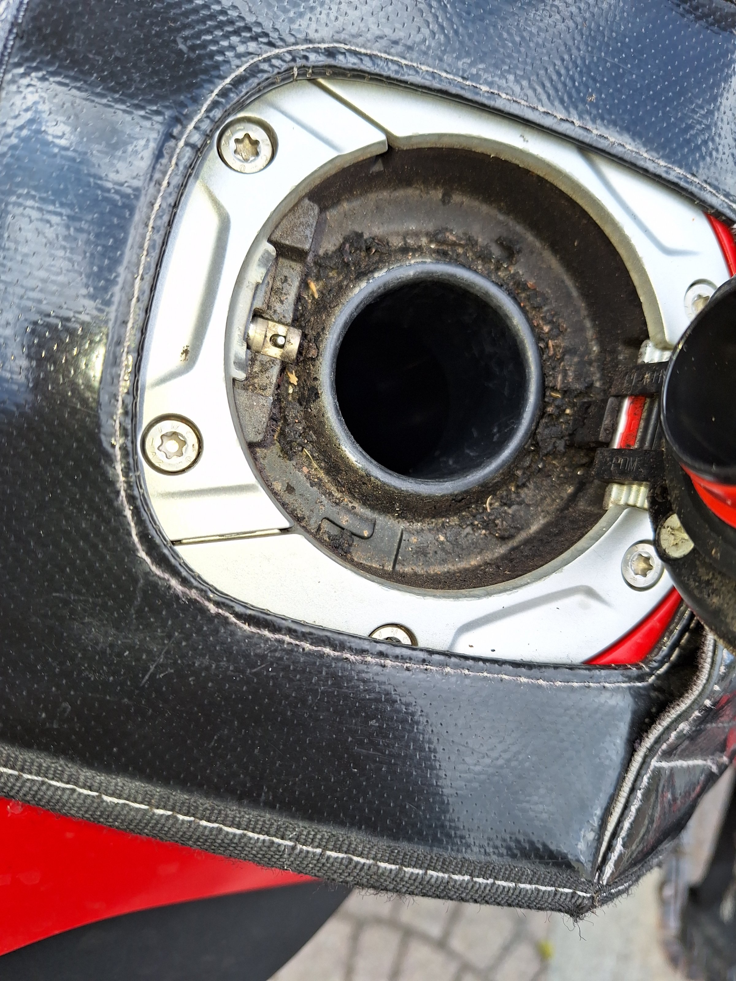 Kräftig draufdrücken hilft beim Öffnen, selbst bei soviel Schmodder. Vielleicht auch nach Tankrucksackringinstallation ohne Beachtung des maximalen Drehmoments:wavespin: