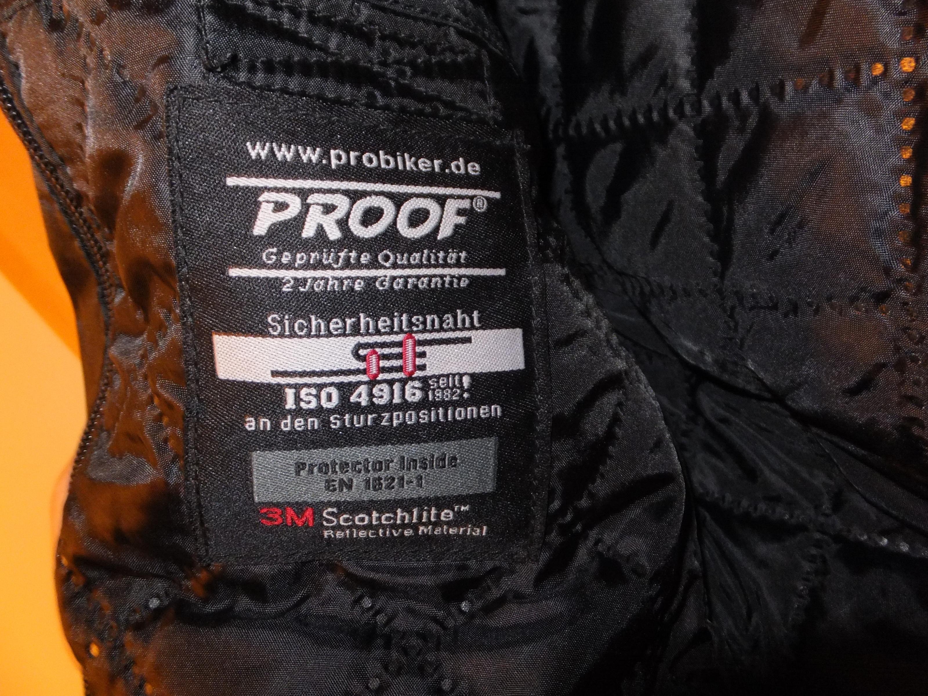 Die Jacke ist atmungsaktiv, wind- und wasserdicht, entnehmbares Innenfutter, Ärmel sind durch Reißverschlüsse um 4 cm längenverstellbar. Protektoren an den Schultern und Ellenbogen. Ein Rückenprotektor wäre nachrüstbar.