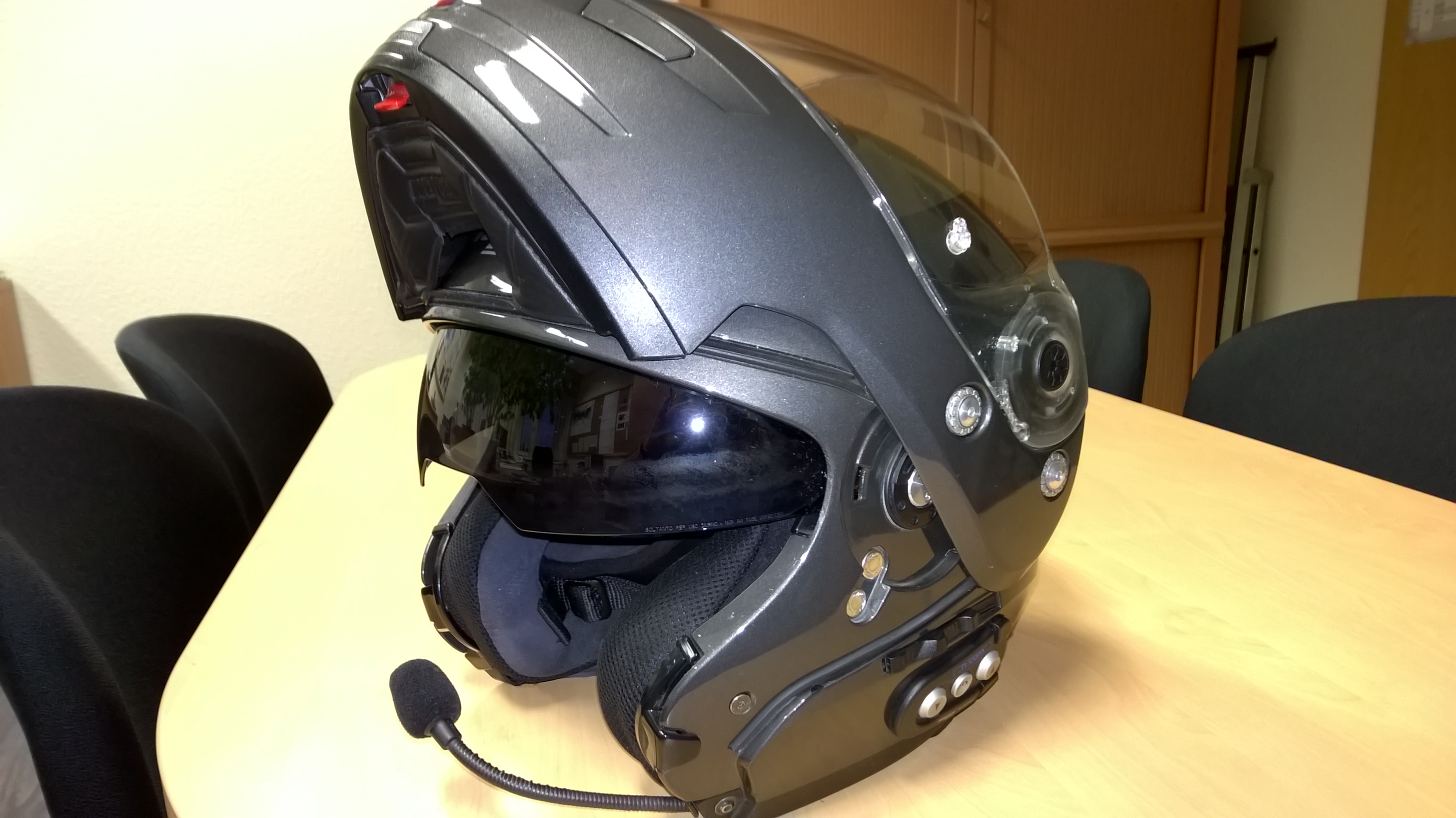 Ich hab ihm ein neues Visier, klar, ein neues Pinlock-Visier, klar und ein neues Sonnenvisier gegönnt. Außerdem hat er das N-Com-Basic-Kit und das N-Com Blutooth-Kit installiert, sodass man sich die Navi-Ansagen per Blutooth in den Helm übermitteln lassen kann oder auch vom Handy Musik oder Anrufe anhören kann.