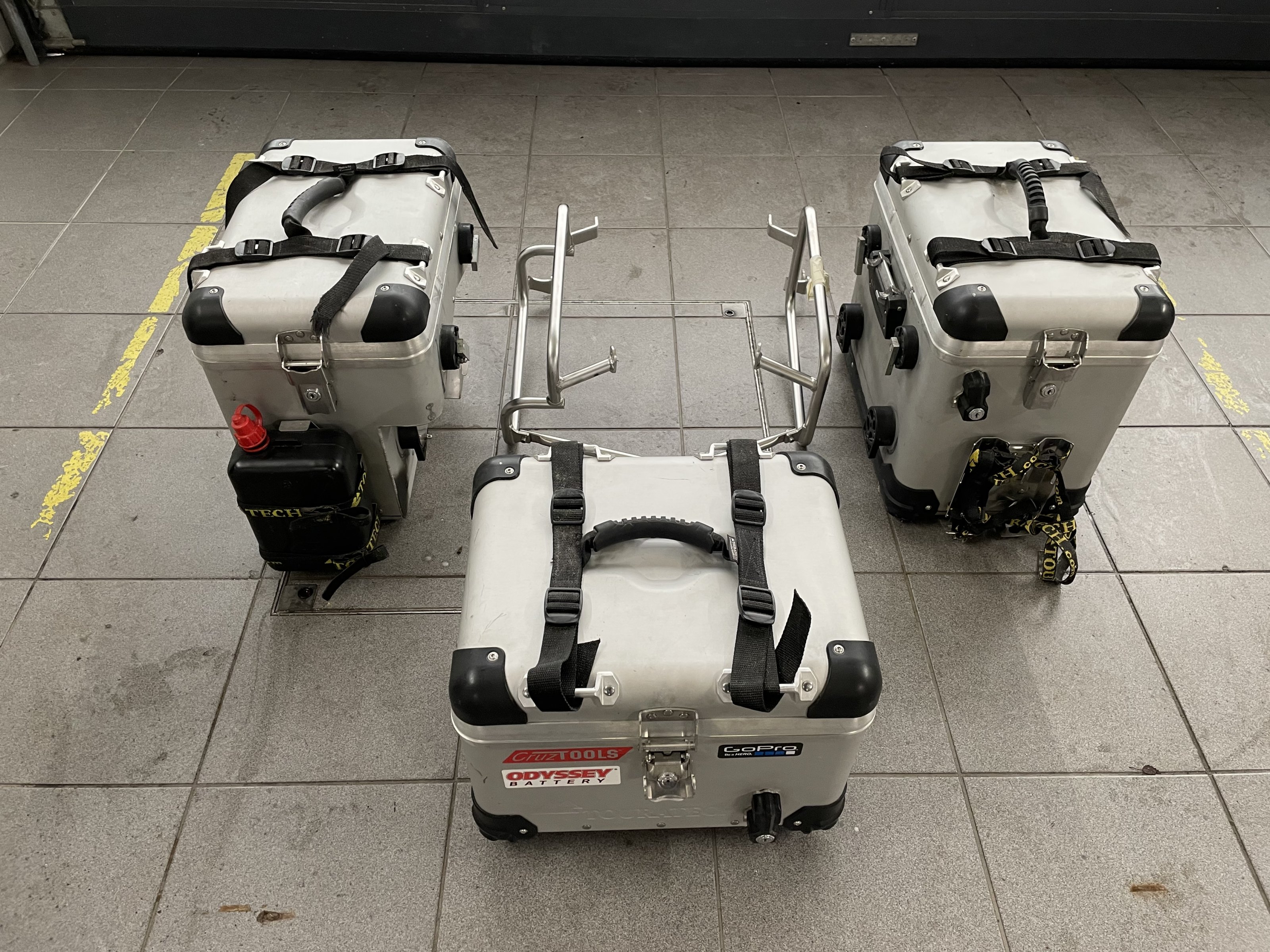 Zega Pro mit Rapid Trap, Riemen mit Griffen, links Flaschenhalter, rechts Ölkanister mit Halter.