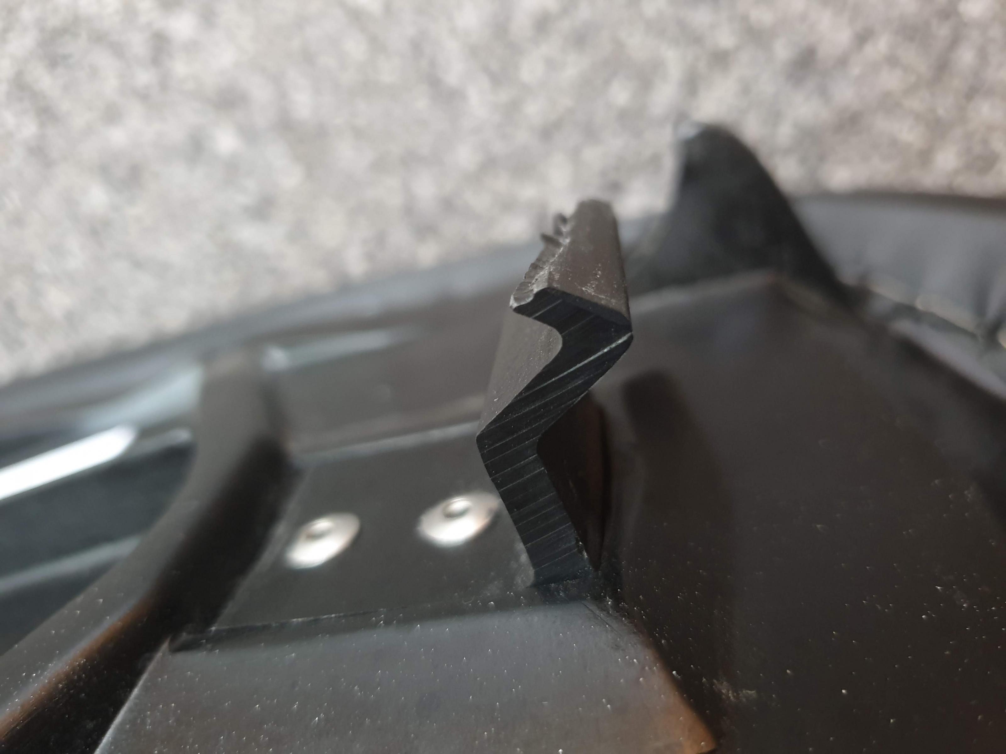 an der hintern Befestigung fehlt ein kleines Stück, hat aber keinerlei Auswirkung zur Befestigung, da auf der gegenüberliegenden Seite eingeklipst wird