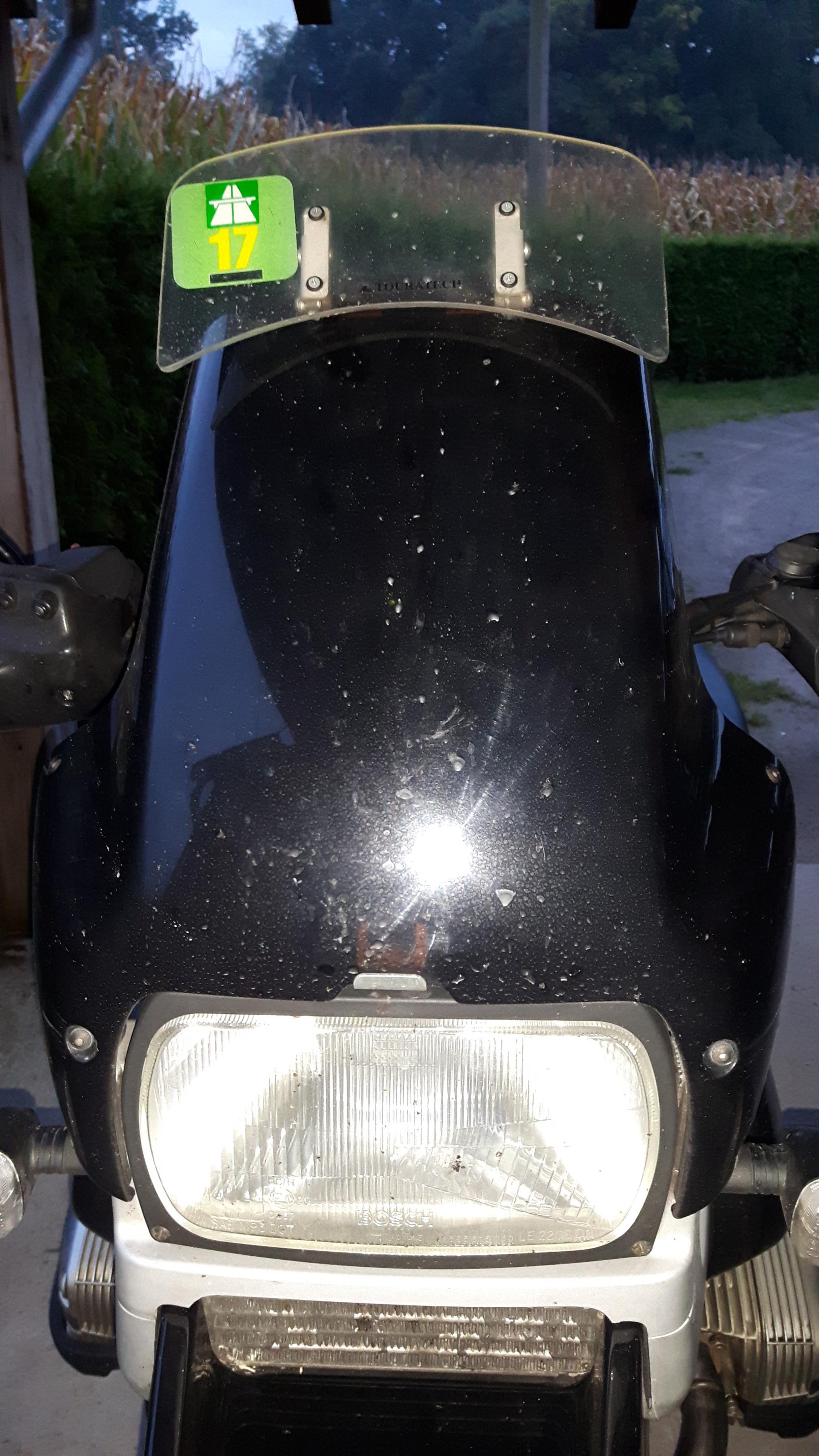 - original Scheibe mit Touratech Aufsatz. Scheibe und Aufsatz sind nicht gesprungen oder gerissen, weisen aber natürlich Gebrauchsspuren auf. Gerade im Bereich der Aufnahme des Touratech Aufsatzes.