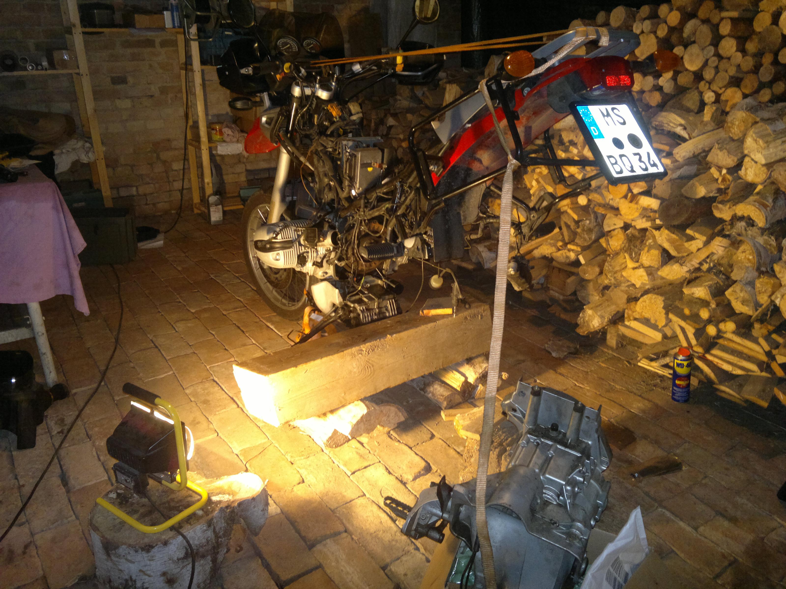 Das war ja einfacher als gedacht, dachte ich bräuchte echt 'ne zweite Person. Hab so 2,5 Std. zum zerlegen gebraucht - bis dahin problemlos. Hab einfach ein paar mehr Führungsbolzen verwendet (glaub 4Stk., hatte noch 'ne Kiste M8x100) und dann ein paar Stück Holz unter gelegt. Bis auf ein vergnaddeltes Gewinde an der rechten Fußrastenplatte keine defekten Gewinde (*freu*). Probleme gabs dann beim Gegenhalten zum lösen der dicken Bolzen.