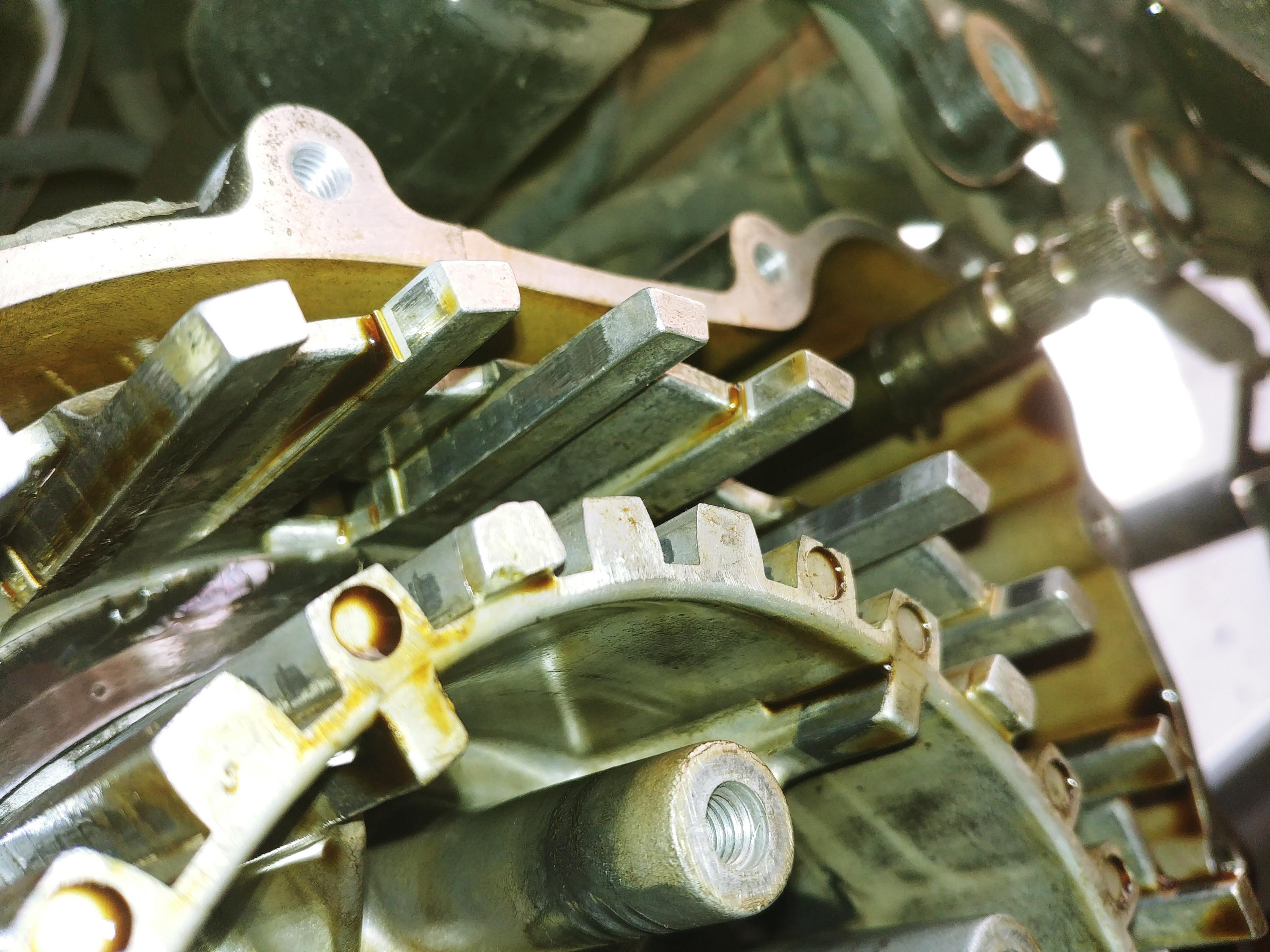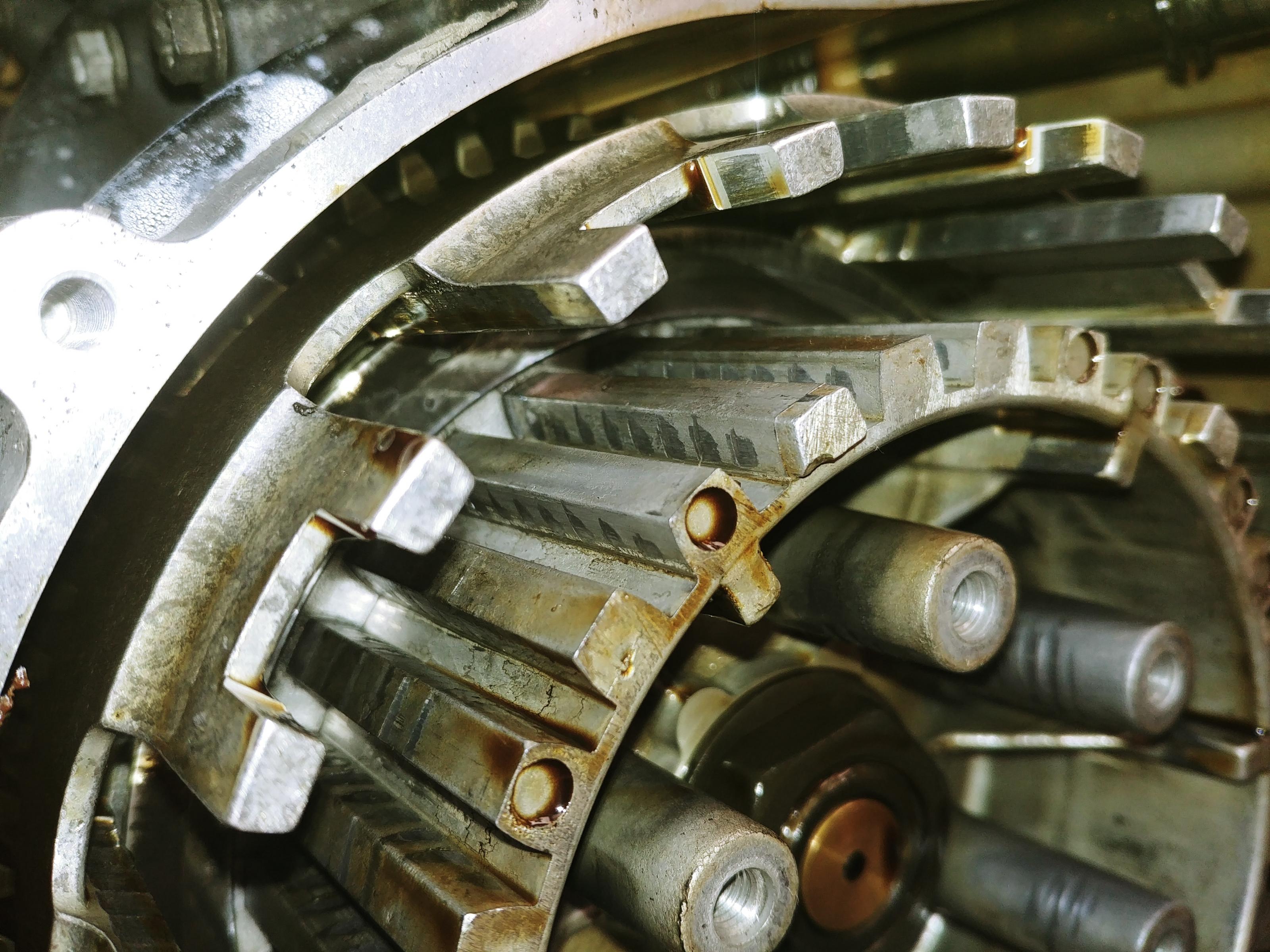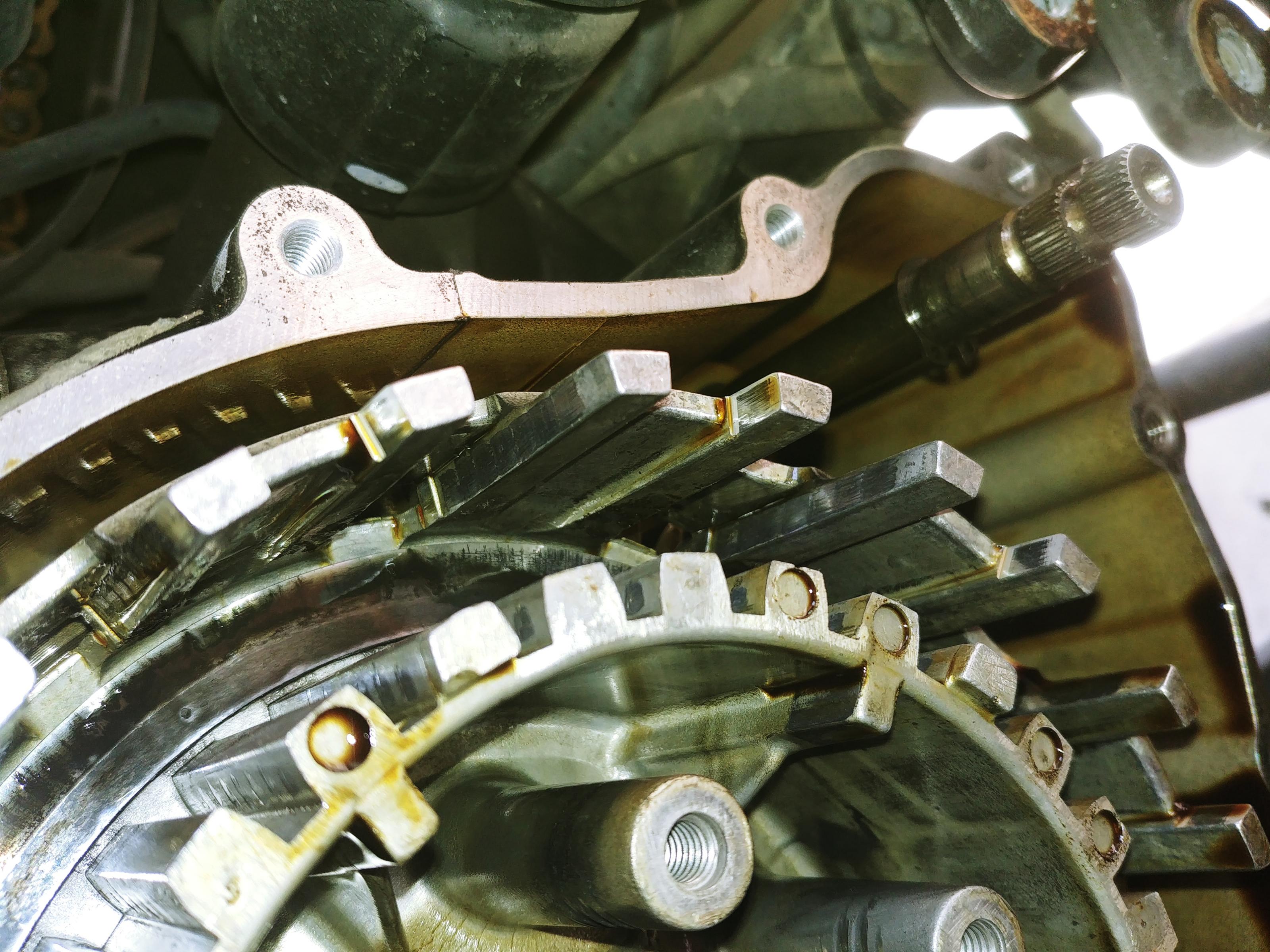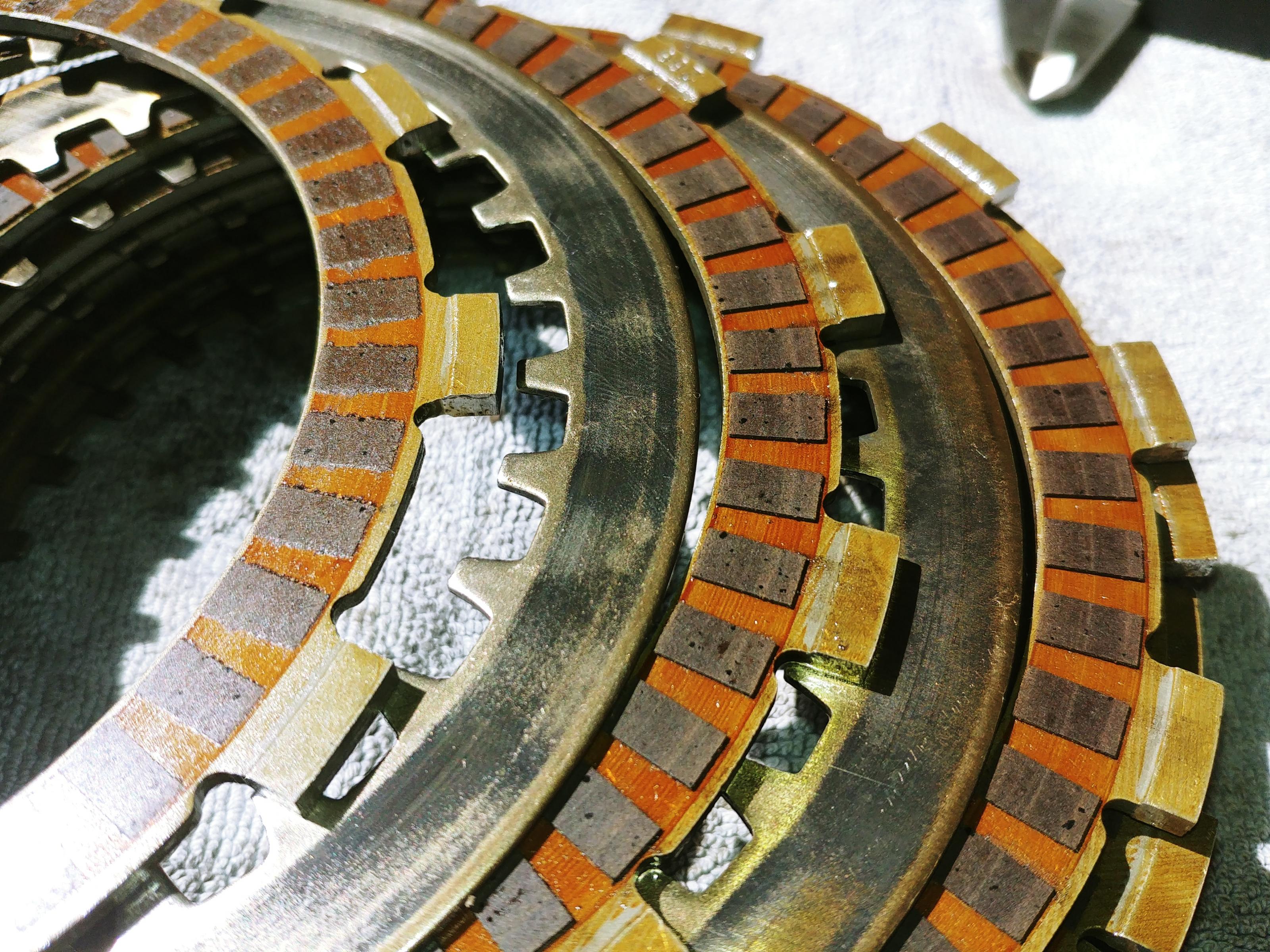 - Kupplungsnabe und -korb haben mittlere Schleifspuren und Kanten von den Belägen