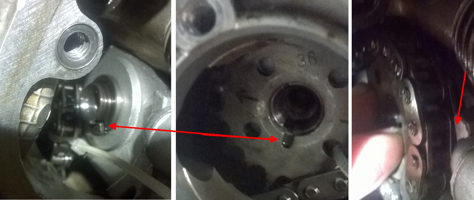die perspektive mag täuschen, aber im mittleren bild sieht es für mich aus, als würde die nase des kettenrades NICHT EXAKT IN DER NUT der nockenwelle sitzen.... Hier die Bilder: