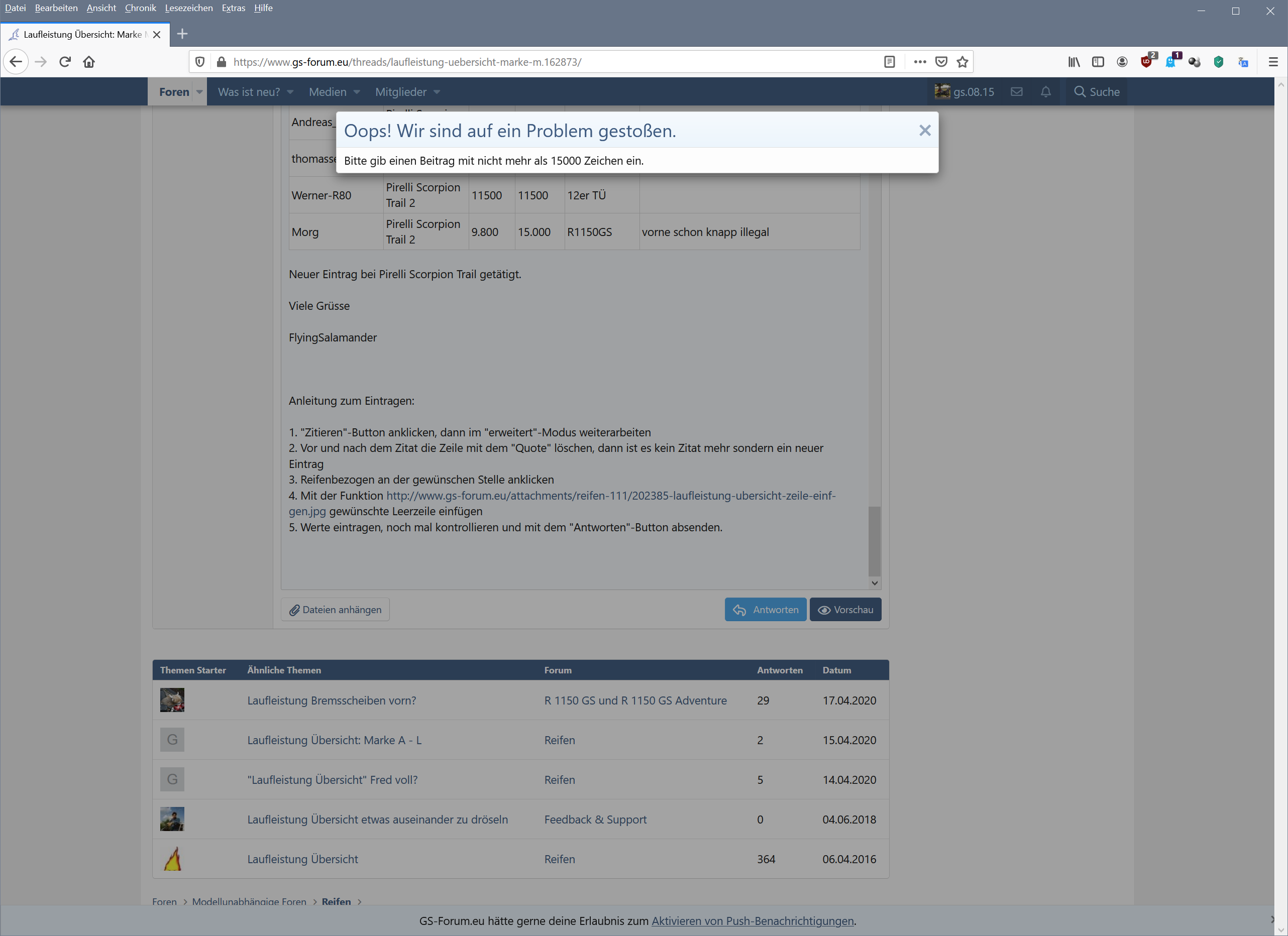 UserReifenKM vornKM hintenMotorradBemerkungen