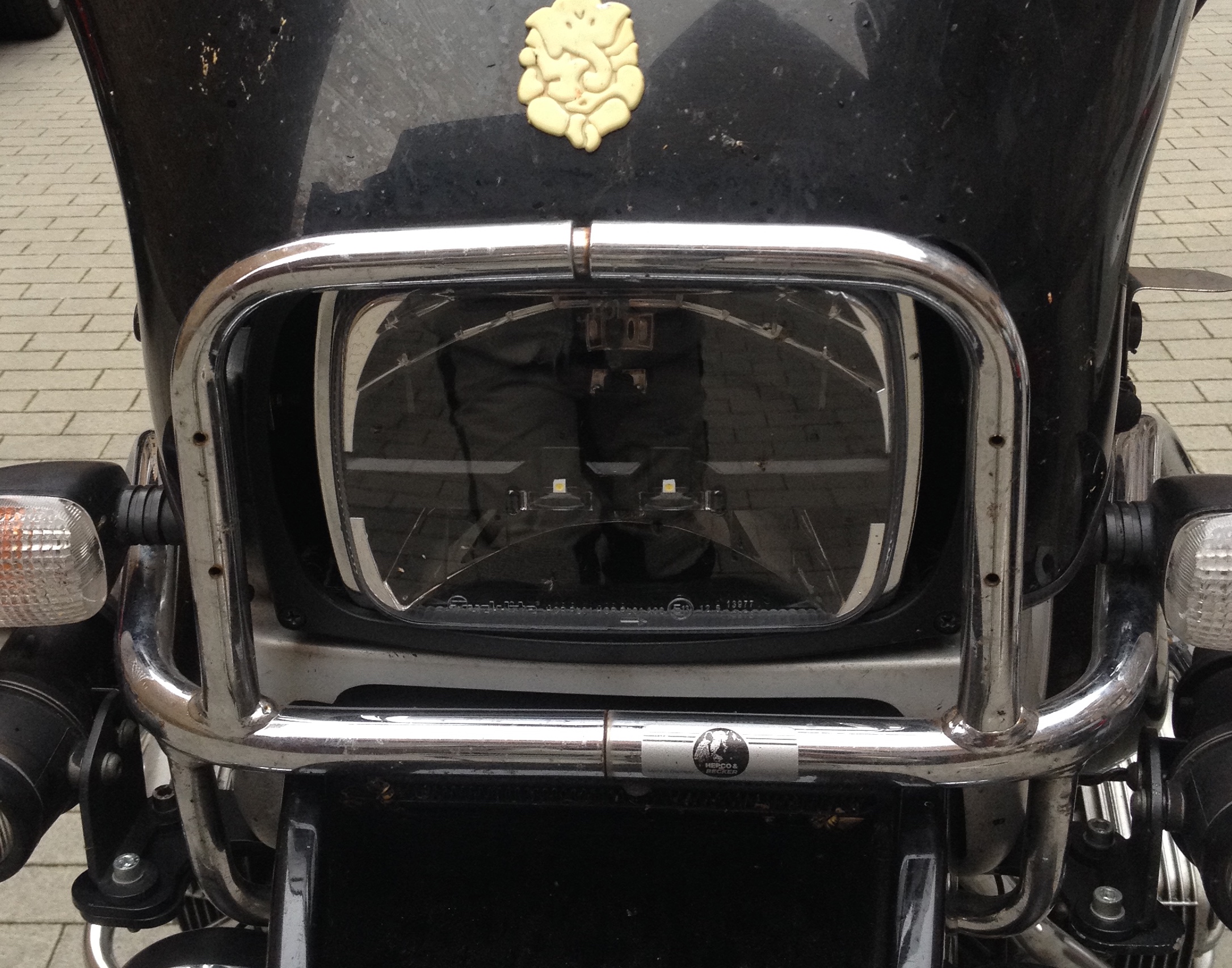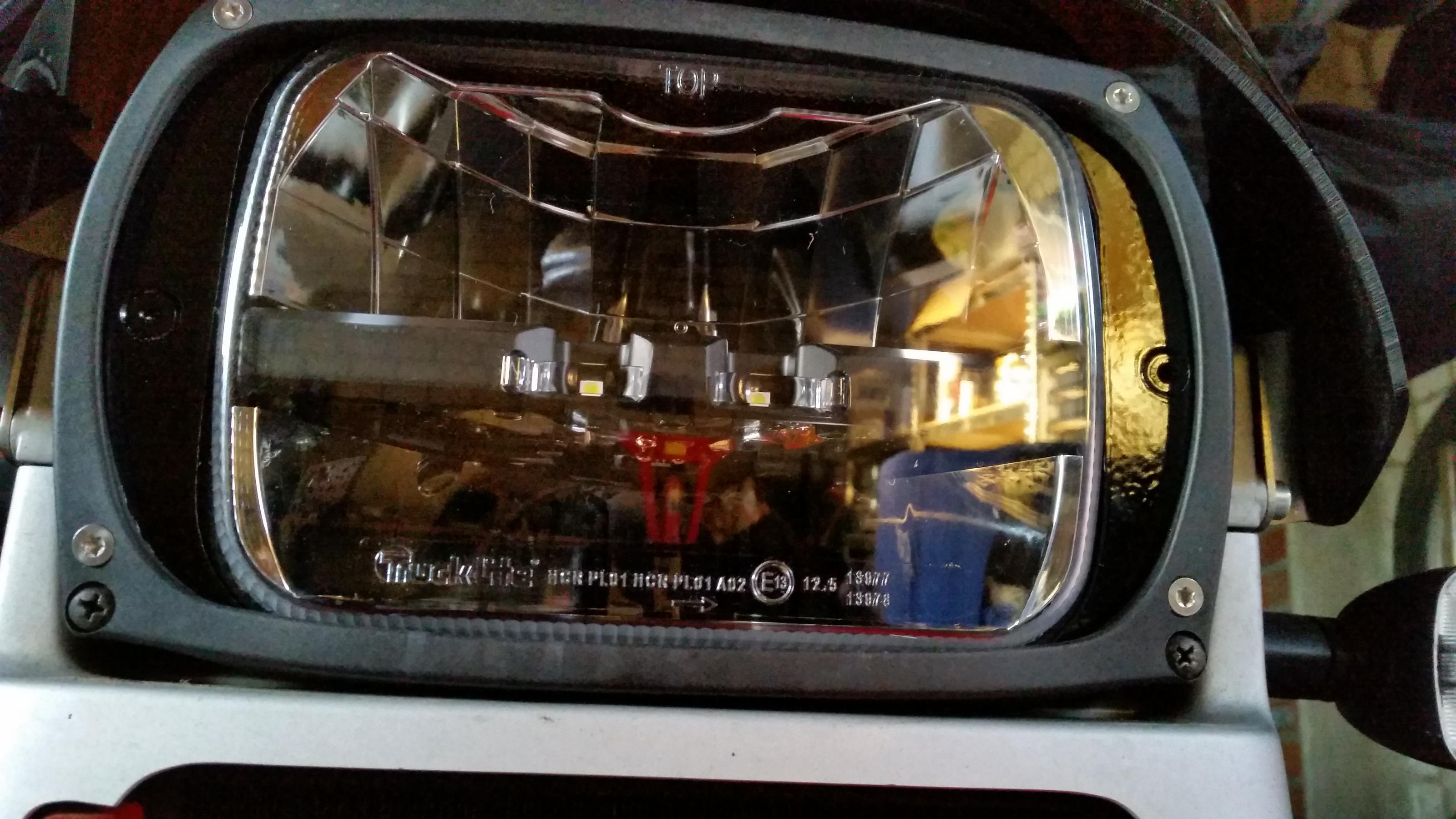Gestern nun gegen folgenden LED-Scheinwerfer kfz-elektrik-uphoff.de - Truck-Lite 5x7" LED Hauptscheinwerfer (mit E-Kennzeichnung zugelassen) ausgetauscht. Dazu hab ich ein "Busscheinwerfer-gehäuse" genommen und einen Chrom-Lampenring von einem Jeep-Wrangler. Den Lampenring mit den Befestigungslaschen in das Gehäuse implementiert und dadurch einen sicheren, vor allem seitlichen, Halt für den LED-Einsatz gefunden. Der LED ist ca 200 mm breit, der Busscheinwerfer 240mm . Je 20 mm bleiben als offner Rand der später noch mit einem VA-Blech kaschiert wird. Die Lichtausbeute ist fantastisch, egal ob Abblendlicht oder Fernlicht, die Strasse wird super ausgeleuchtet.