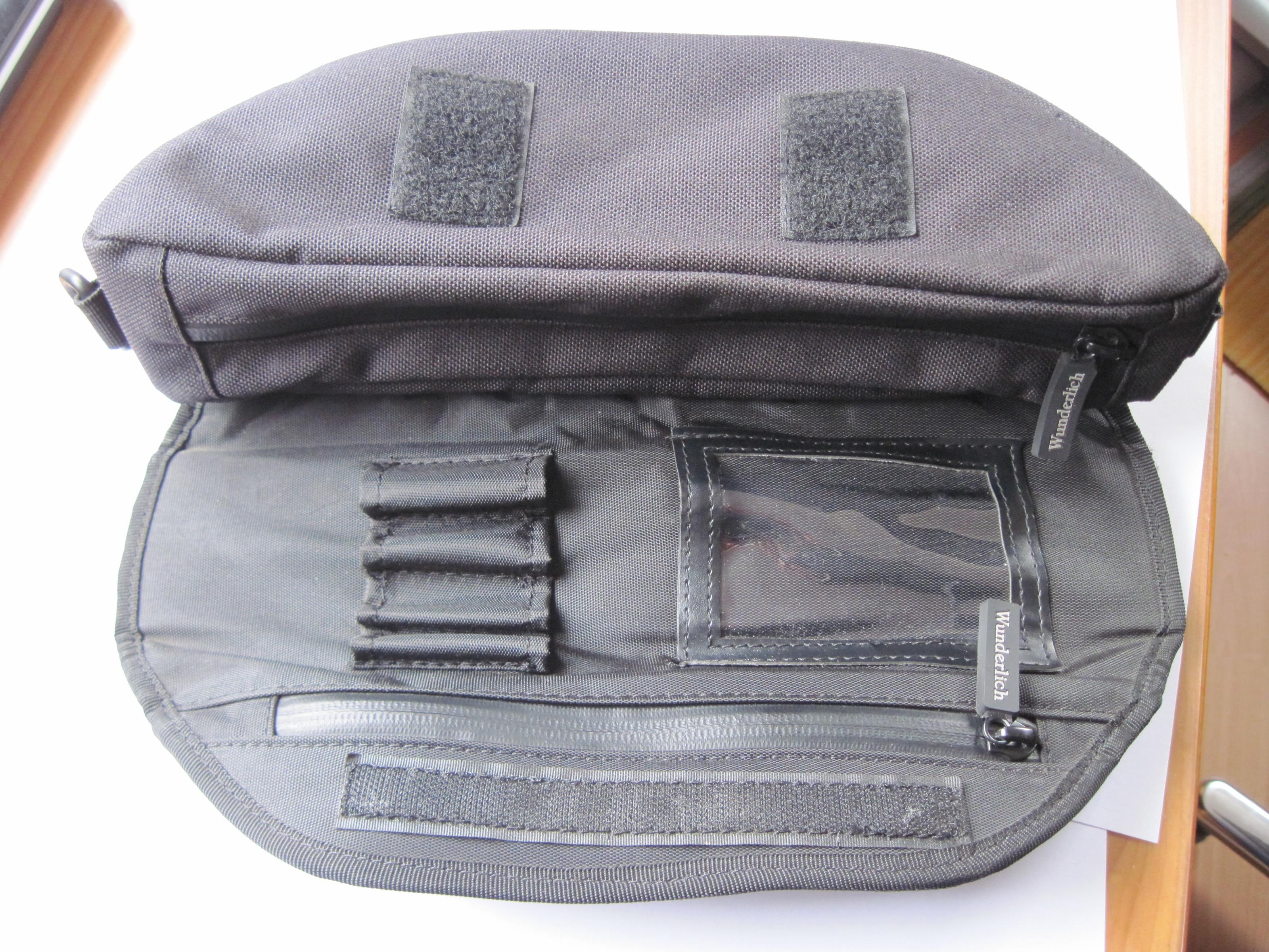 Sie ist aus wassedichtem Cordurra Material. Großes Hauptfach und kleineres Deckelfach mit wasserdichten Reißverschlüssen. Innen Halter für z.B. EC- Karte, Führerschein, Halter für Stifte. Handy, Navi kann verstaut werden, wassergeschützter Kabelzugang auf der Rückseite.