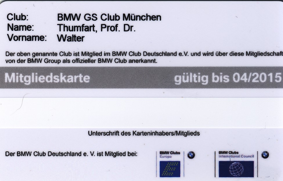 Der offizielle BMW Ausweis bedeutet: Unfallversicherung, 10% BMW Rabatt, 10% Wunderlich Rabatt, 5% Touratech Rabatt und 20 andere Anbieter von Ermässigungen. Ausserdem Premiumservice bei BMW Motorrad, zahlreiche Einladungen zu Events von BMW Motorsport und unserem BMW GS Club.:p