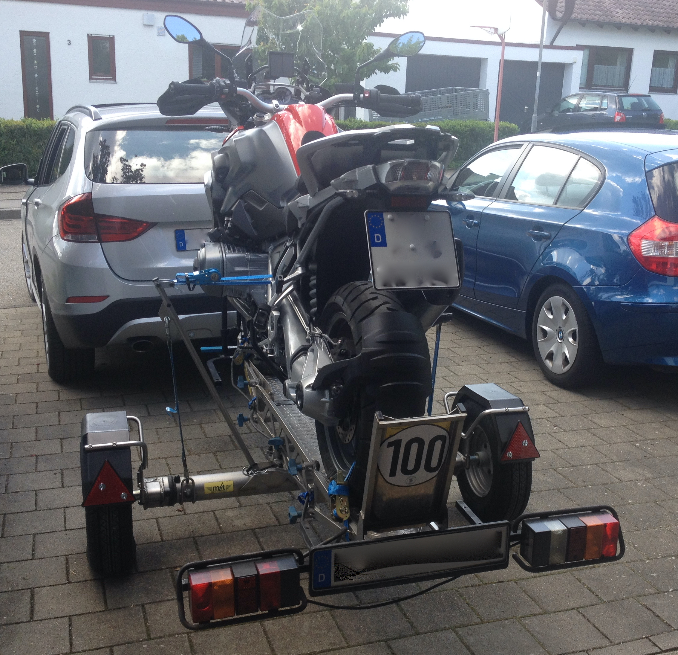 Das Motorrad wird auf der Fahrschiene mit dem Vorderrad- und Hinterrad an der Felge mit Ratschengurten verzurrt. Dies ist ein wesentlicher Unterschied zu anderen Anhängern, bei denen die Maschine in die Federung gezogen wird. Beim mft-multi-trailer kann das Motorrad mit seiner Masse in seiner eigenen Federung schwingen.