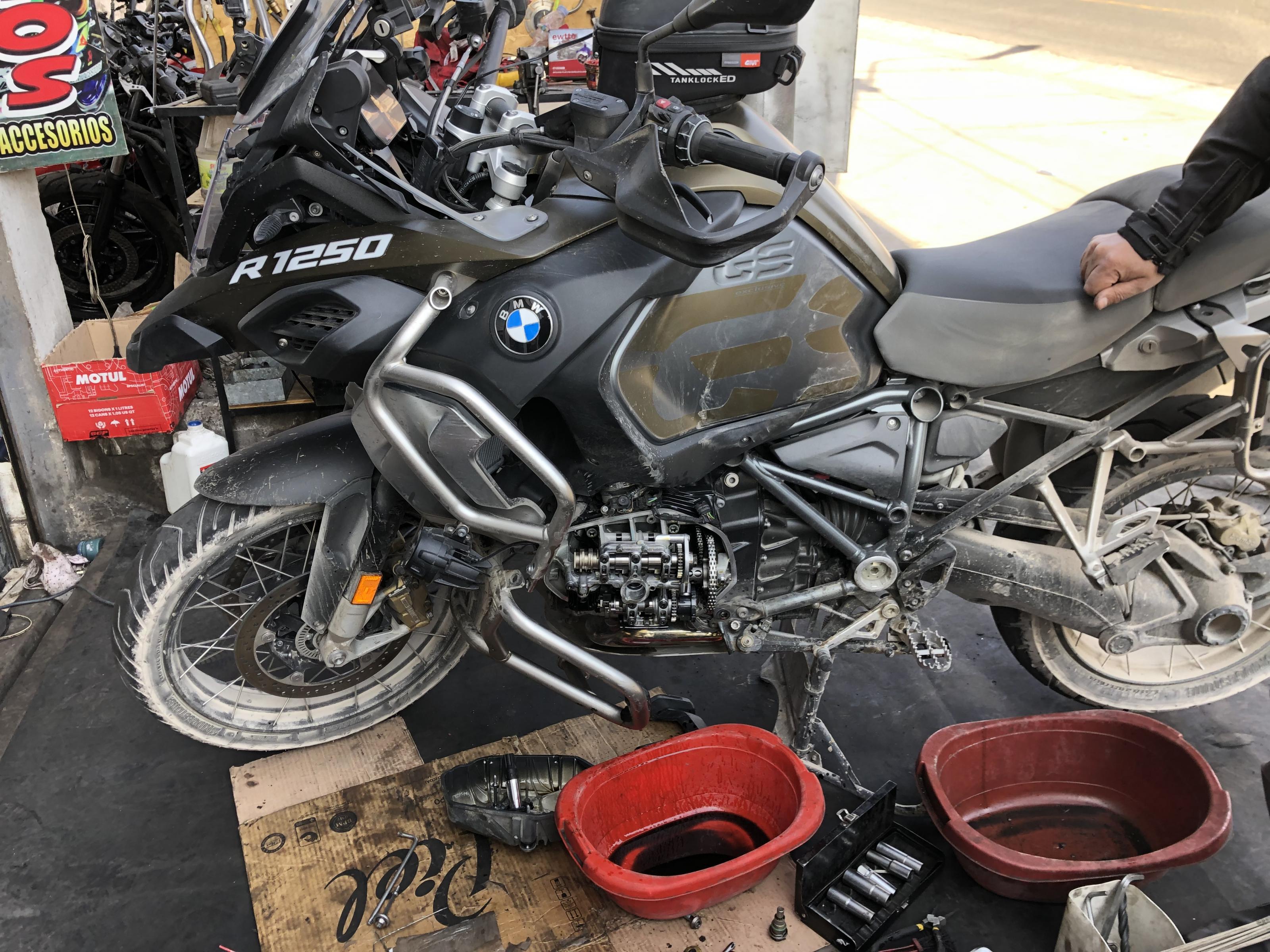 Schlimmer ist jedoch, das ich in einer Haarnadelkurve, ca 4.300m, plötzlich ins Leere bei der Fussbremse getreten bin, ohne jegliche Vorankündigung, ging einfach nicht mehr. Resultat, Sturz in der Kurve (langsam, mir ist nix weiter passiert) aber der linke Ventildeckel wurde von einem kleinen Felsen etwas verschoben, ca 1mm, und es hat die Gummidichtung zerlegt. Folge Ölaustritt, nur Tropfen, aber immerhin. Bin dann umgekehrt und die 3h noch langsamer zurückgefahren, da ich da wusste was auf mich zukommt. Leider ging mir dann auch noch der Sprit aus, zum Glück konnte ich an einem Bauernhaus eine Gallone 84er kaufen, die Maschine hat tadellos damit funktioniert. Zurück in Arequipa habe ich dann einen begabten Schrauber gefunden und wir konnten die Dichtung reparieren, die BMW Werkstatt ist ja 1200km weg. Ist aber trocken, alles funktioniert.