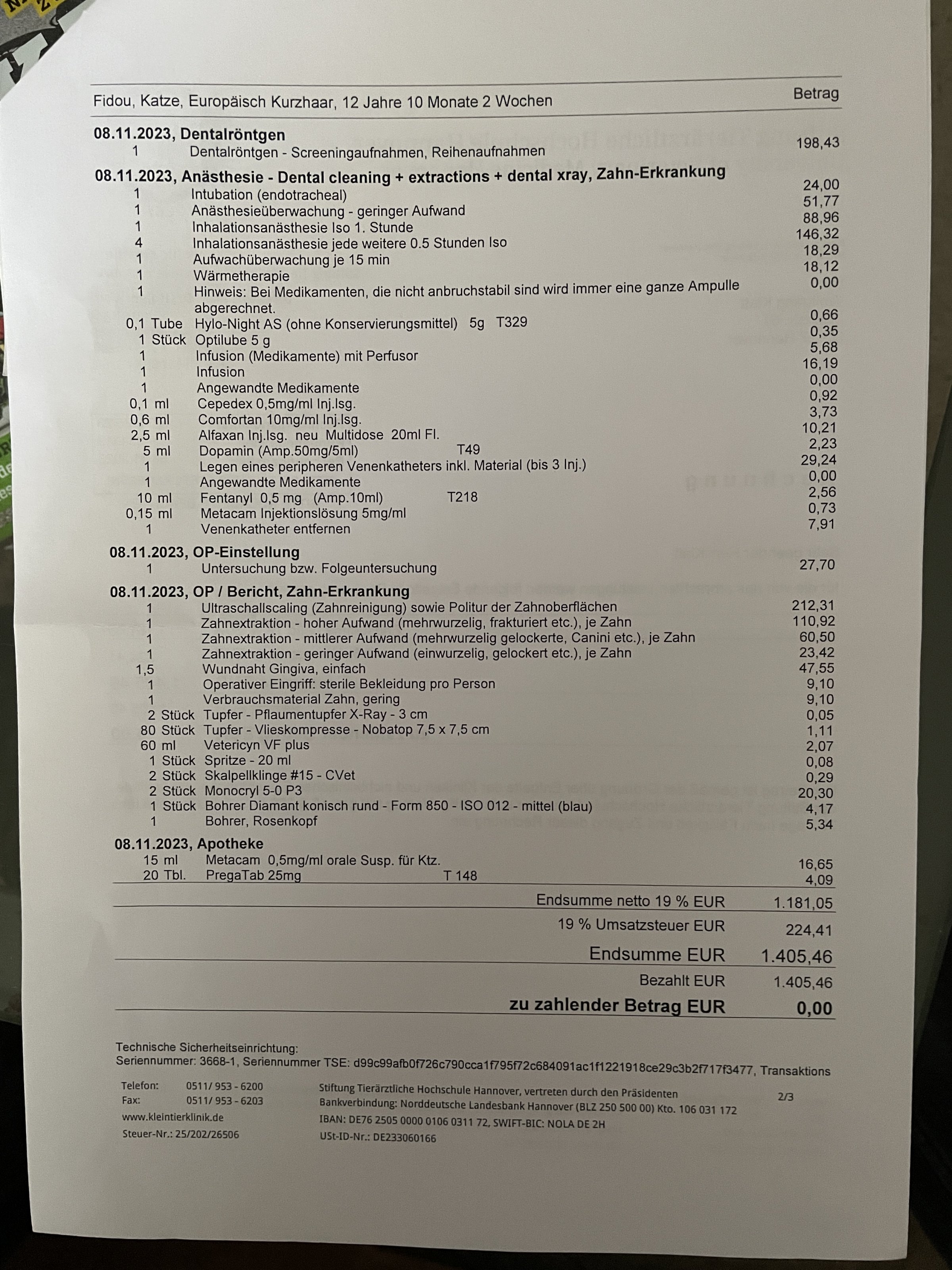 Das ist wirklich heftig, denn das kostet für mich als Mensch beim Zahnarzt unter 500 Euro. Und das ohne AusgangssperreTja, jetzt wurde forl festgestellt. 2,5 Zähne gezogen, Zahnsteinbehandlung, Kater halbwegs traumatisiert, 1 Woche Ausgangssperre, 1.400 €.![]()