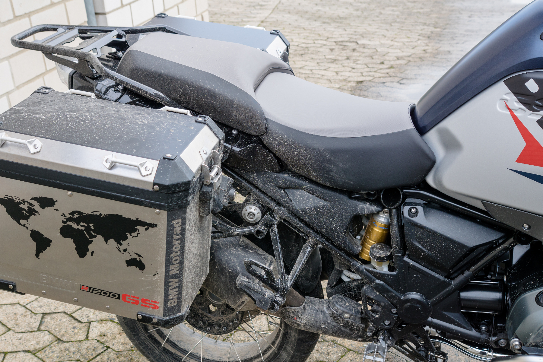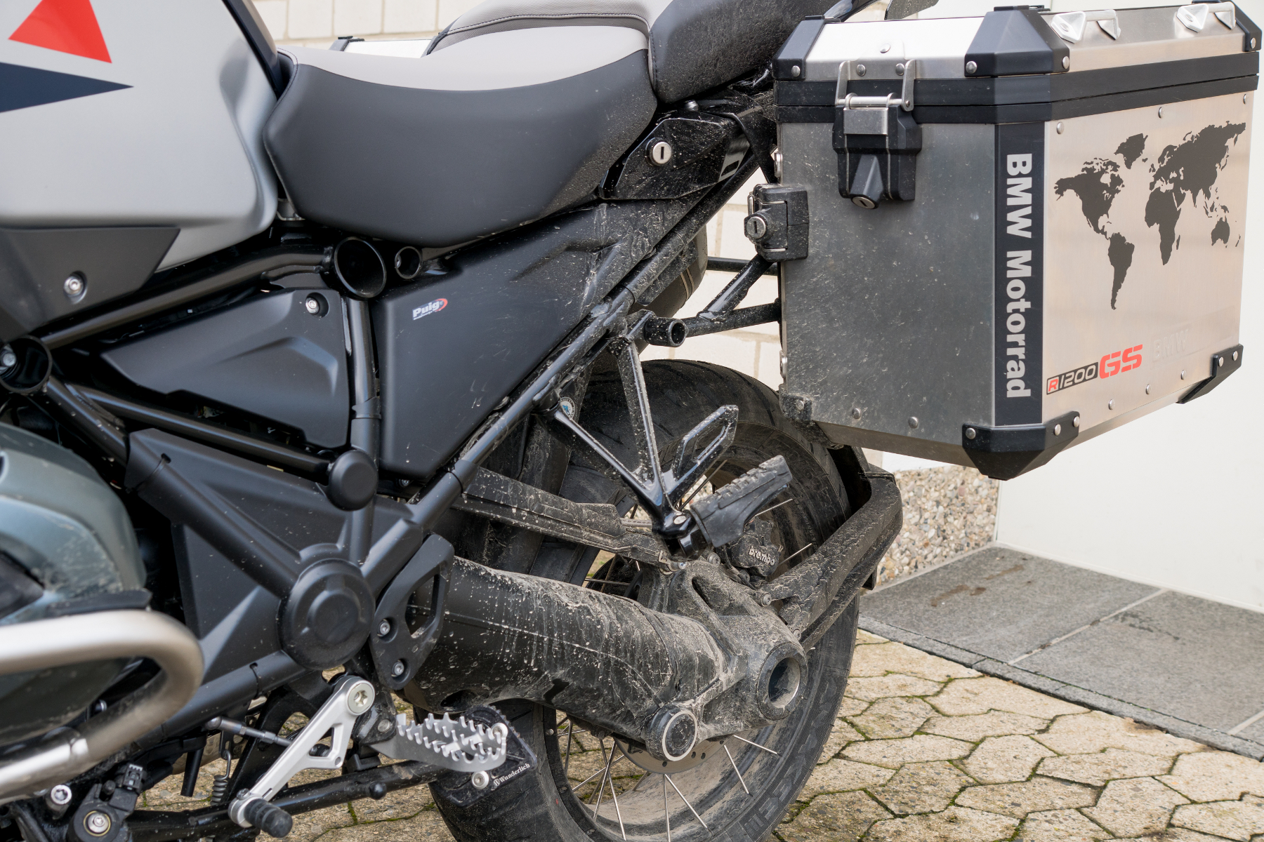 . Das rechte Hosenbein voll bis zum Po mit Dreck und das Linke dafür erfreulicherweise nur leicht bis zur Wade vollgespritzt. Auspuff, Koffer und Kardan mit einer grauen Masse überzogen, dabei war ich doch gar nicht in der Tundra sondern nur auf einer deutschen Bundesstraße.