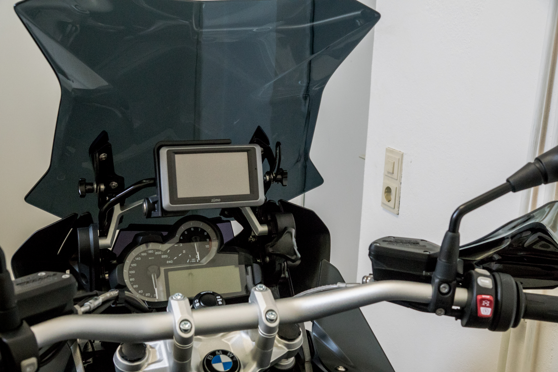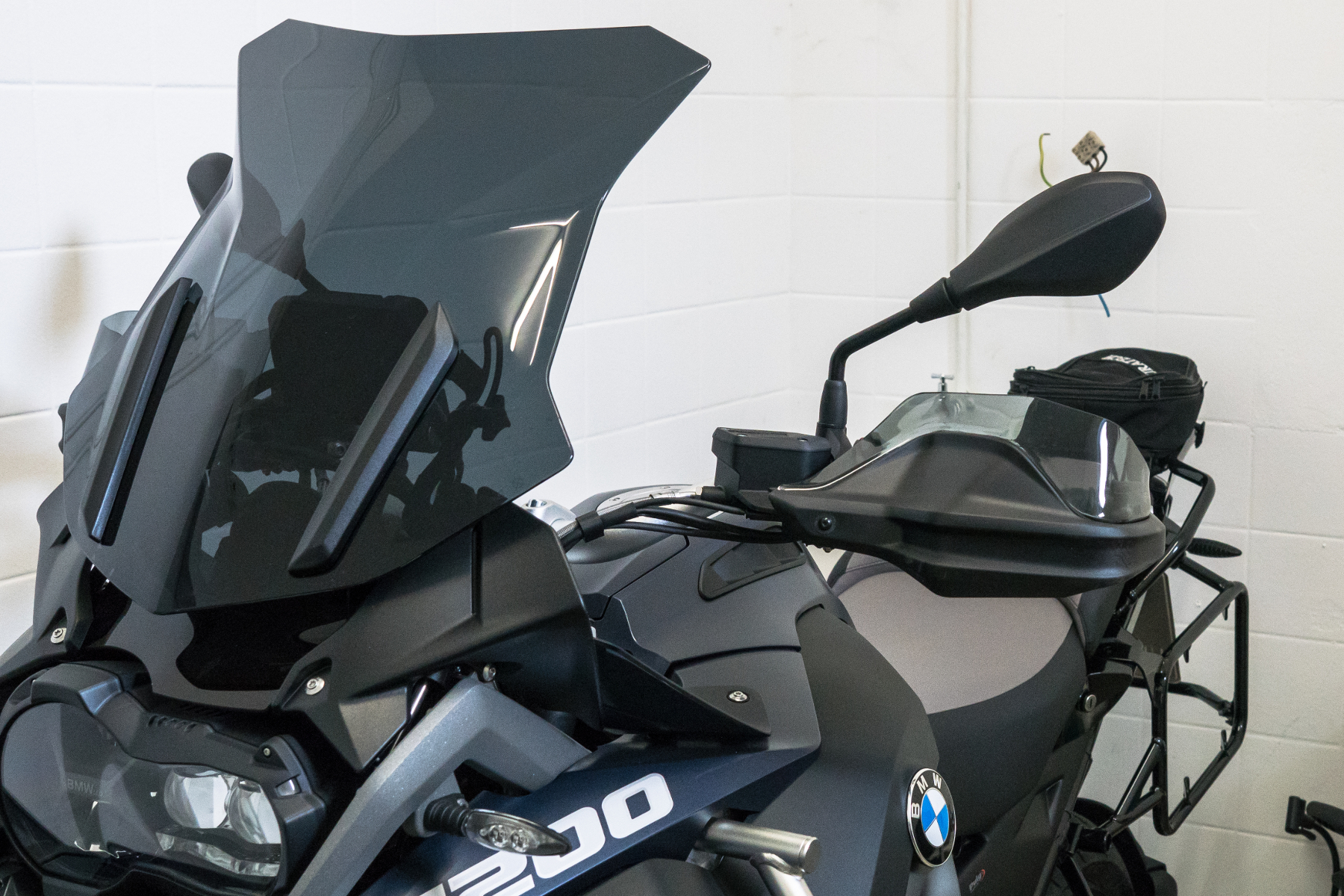 Durch meine Recherchen im Forum war ich der Meinung, um Ruhe im Helm zu haben, muss ein höheres Windschild wohl auf alle Fälle sein. Die Wahl fiel auf ein getöntes Puig-Windschild. Optisch nicht schlecht, direkt beim Händler vor Abholung der GS montiert und nach der Heimfahrt auch gleich wieder demontiert