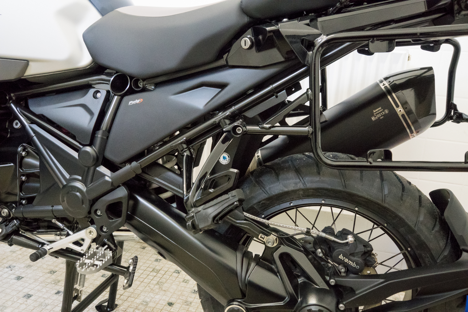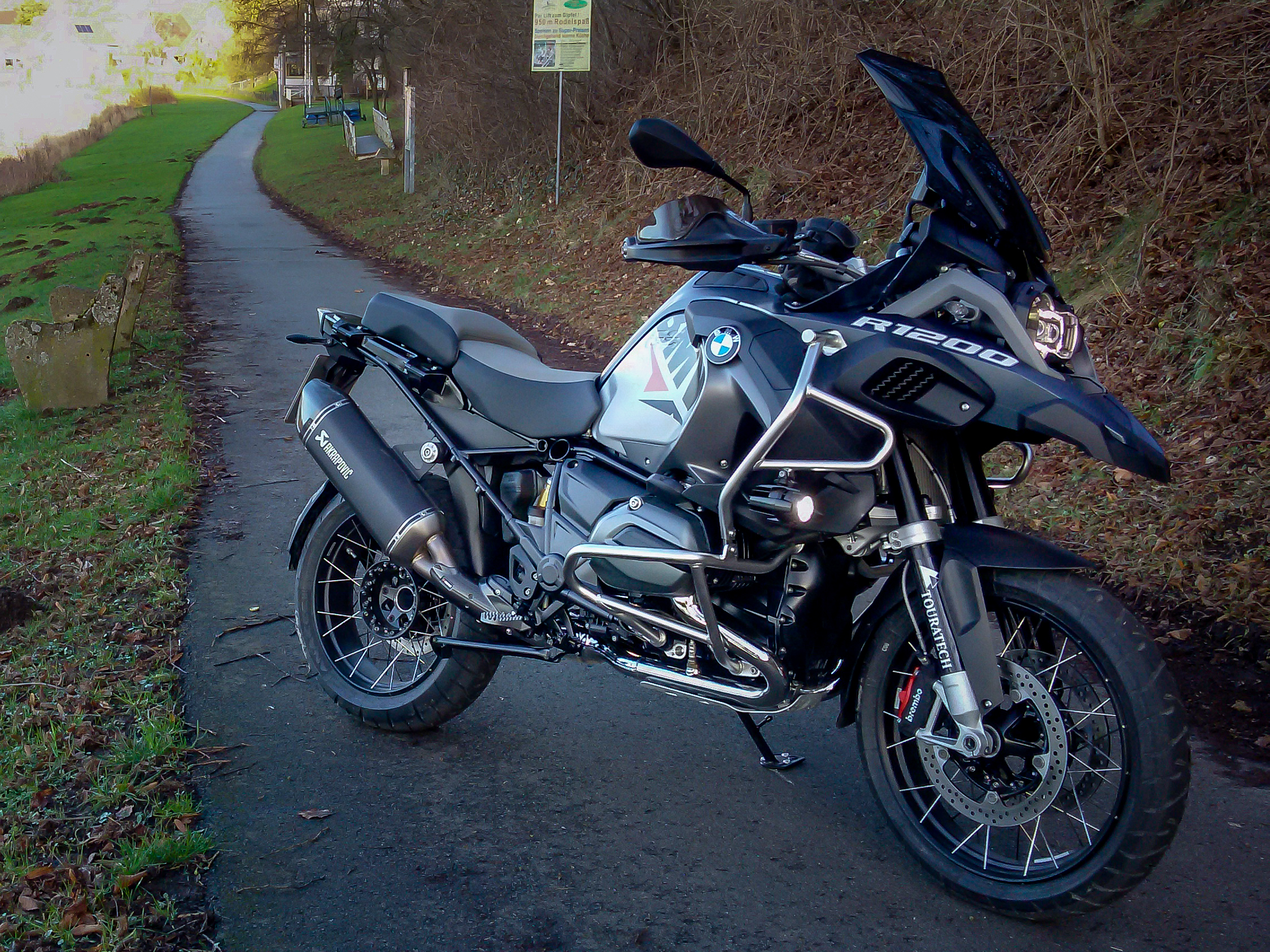 Ein guter Klang gehört für mich zum Motorradfahren einfach dazu und dabei meine ich nicht ein lautes, infernalisches Gebrüll. Der Akrapovic ist natürlich von der Lautstärke schon etwas grenzwertig und für alle, die es besinnlich mögen, definitiv nicht der richtige Auspuff. Aber wer es leise mag, ist mit der GS, ob mit originalem oder Ersatzdämpfer, wohl eh mit dem falschen Motorrad unterwegs. Ich mag den schönen, tief bassigen Sound des Akra, er macht einfach nur süchtig. In Verbindung mit dem Schaltassistenten ein echtes Erlebnis für die Ohren und durch Ortschaften kann man schließlich auch im 4. Gang hindurch fahren, ohne seine Mitmenschen, die vielleicht nicht unbedingt auf tollen Motorradsound stehen, zu belästigen. Die Qual der Wahl lag bei mir nur zwischen dem HP von BMW und den schwarzen direkt von Akrapovic. Es ist der Schwarze geworden, passt für mich einfach perfekter zum ganzen Auftritt der Adventure. Im Nachhinein eine gute Endscheidung!