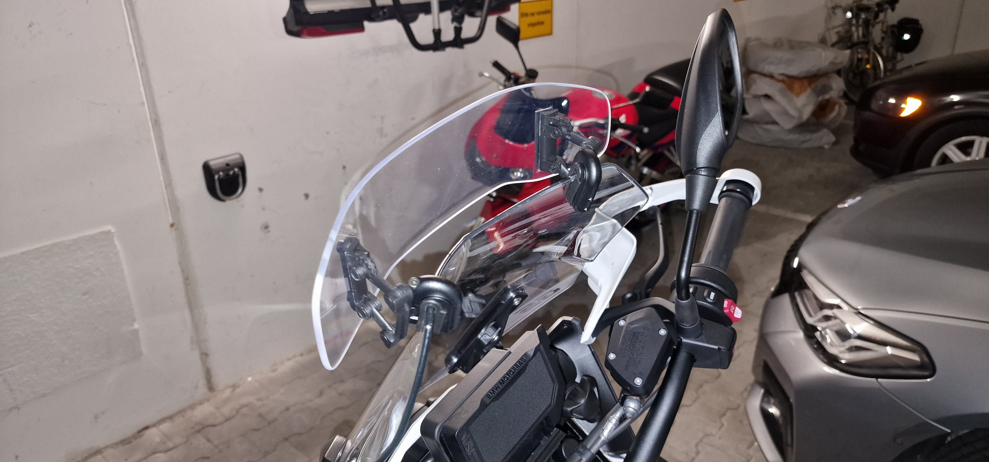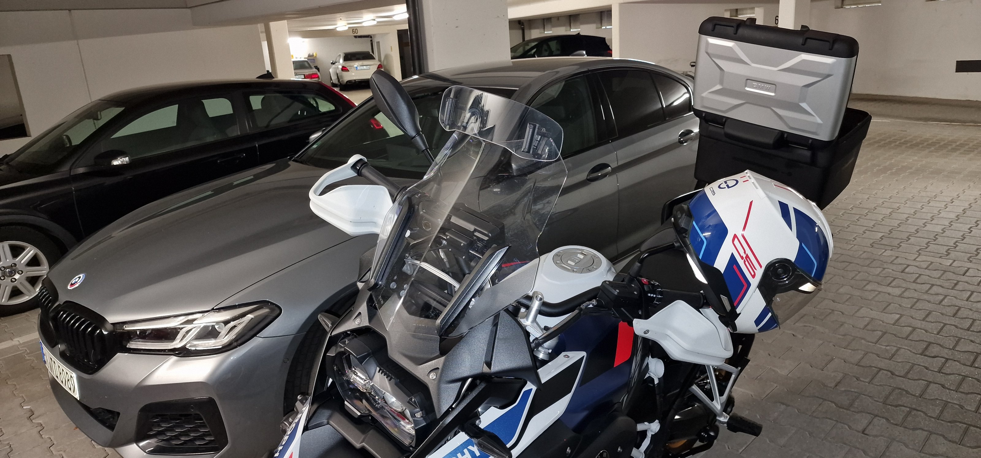 Wir haben gleich ein Vario-Topcase installieren lassen sowie die originalen Motorschützer von BMW (keine Bügel wegen der Schräglagenfreiheit). Gestern konnte ich sie dann endlich holen und 200 km nach Hause cruisen....