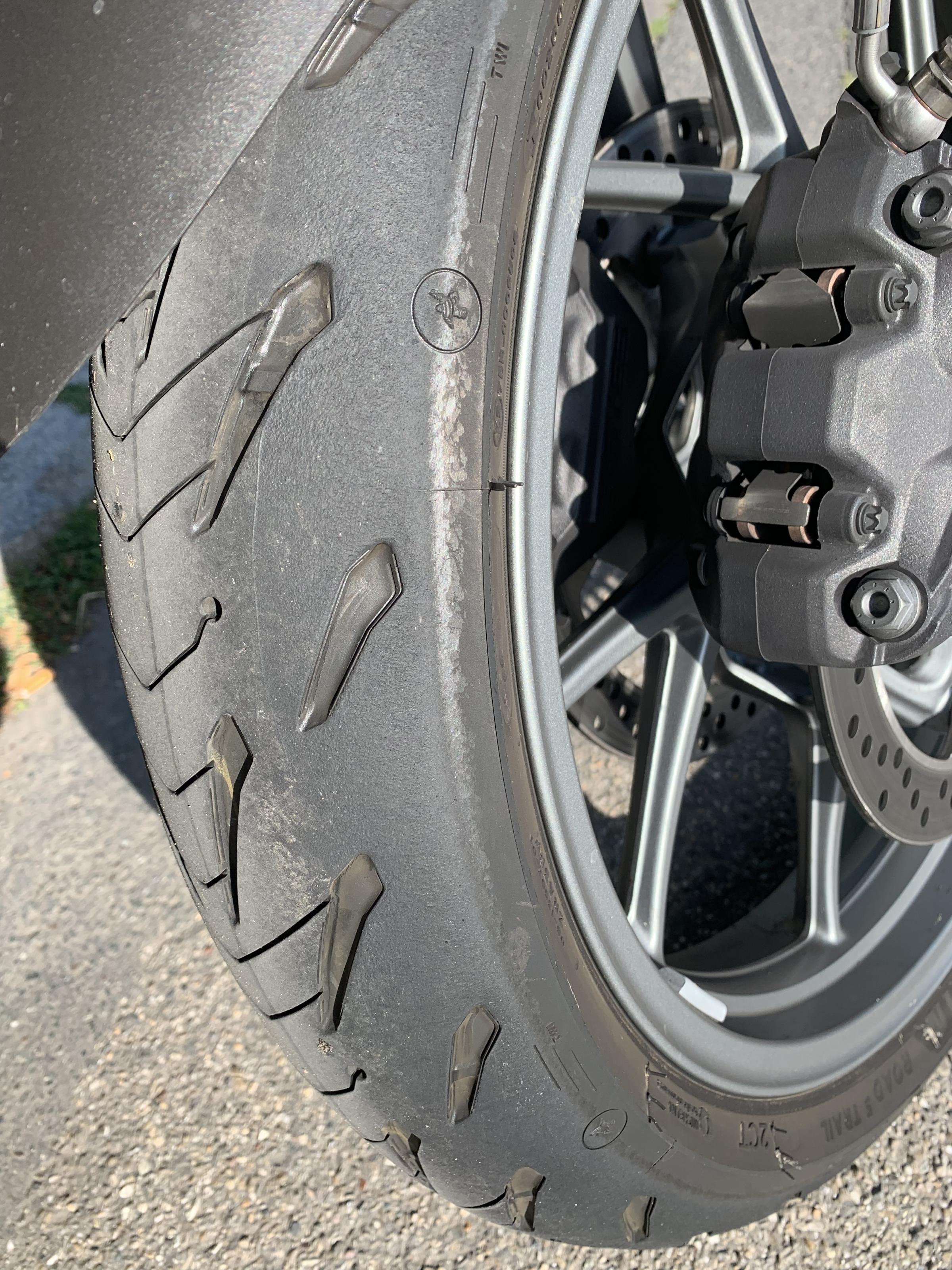 Ich habe mal gemessen: Der Reifen hält länger als ich dachte; nach insgesamt 2.500 flotten Kilometern, davon 2.100 mit Sozia, sind von den anfänglich 6,2mm Profil noch etwa 3,6 mm vorhanden. Über den Daumen macht das also 1mm pro 1000 km Gummiverlust. Mithin kann ich den Reifen etwa 4.500 km legal fahren - das finde ich für einen so sportlichen Reifen sehr gut. Einen Pirelli Scorpion Trail II habe ich bei vergleichbarer Nutzung auch schon nach 5.500 km verschlissen - und der bietet nicht annährend die Haftung in tiefer Schräglage.