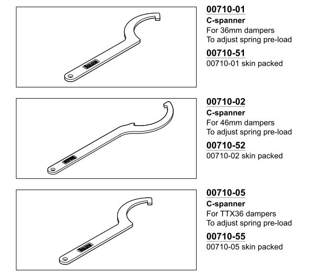 Jedoch klebe ich hier mal einen Auszug aus dem Werkzeugkatalog von Öhlins an und Du kannst Dir den passenden Schlüssel heraussuchen. Teuer sind die meines Wissens nicht. Aber die Suchmaschine bringt es schnell ans Tageslicht.