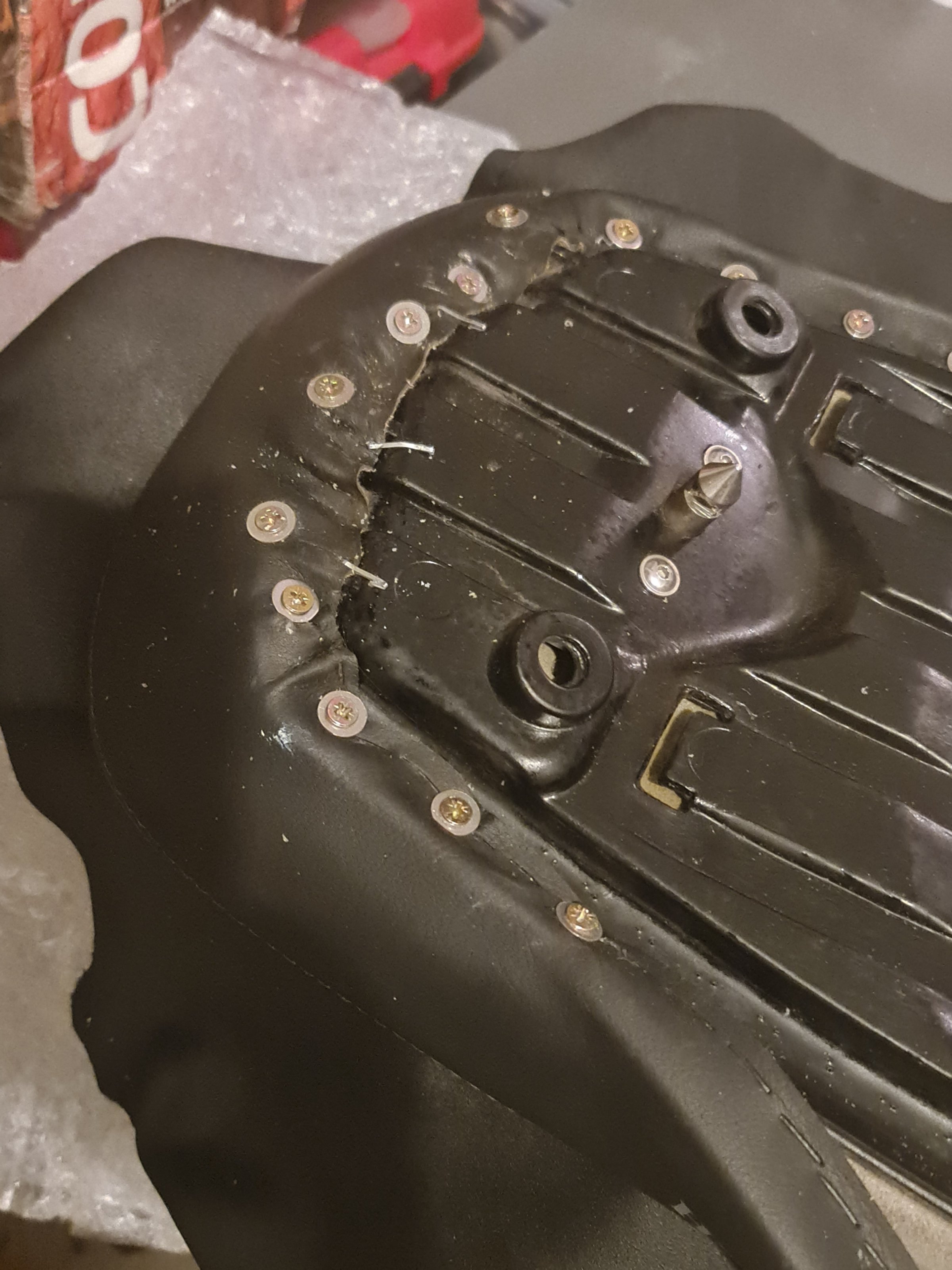 6. Montieren des Bezuges diesmal mit kurzen Schrauben und Beilagscheiben zum besseren Halt. Warum? Ich habe keinen Tacker habe mit Industriestandard, der in engen, tief legenden Stellen Klammern rein schiessen kann. Auch der elektrische Tacker war zu schwach dafuer und man riskiert einen Bruch des Plastiks wenn man zu viel Druck auflegt. Am Ende des Sitzes beginnen, darauf achten dass der Bezug immer gespannt ist und sich langsam nach vorne arbeiten. Beim Vorwaerts-Arbeiten den Bezug etwas dehnen, damit die neue Kruemmung des Sitzes abgedeckt wird.