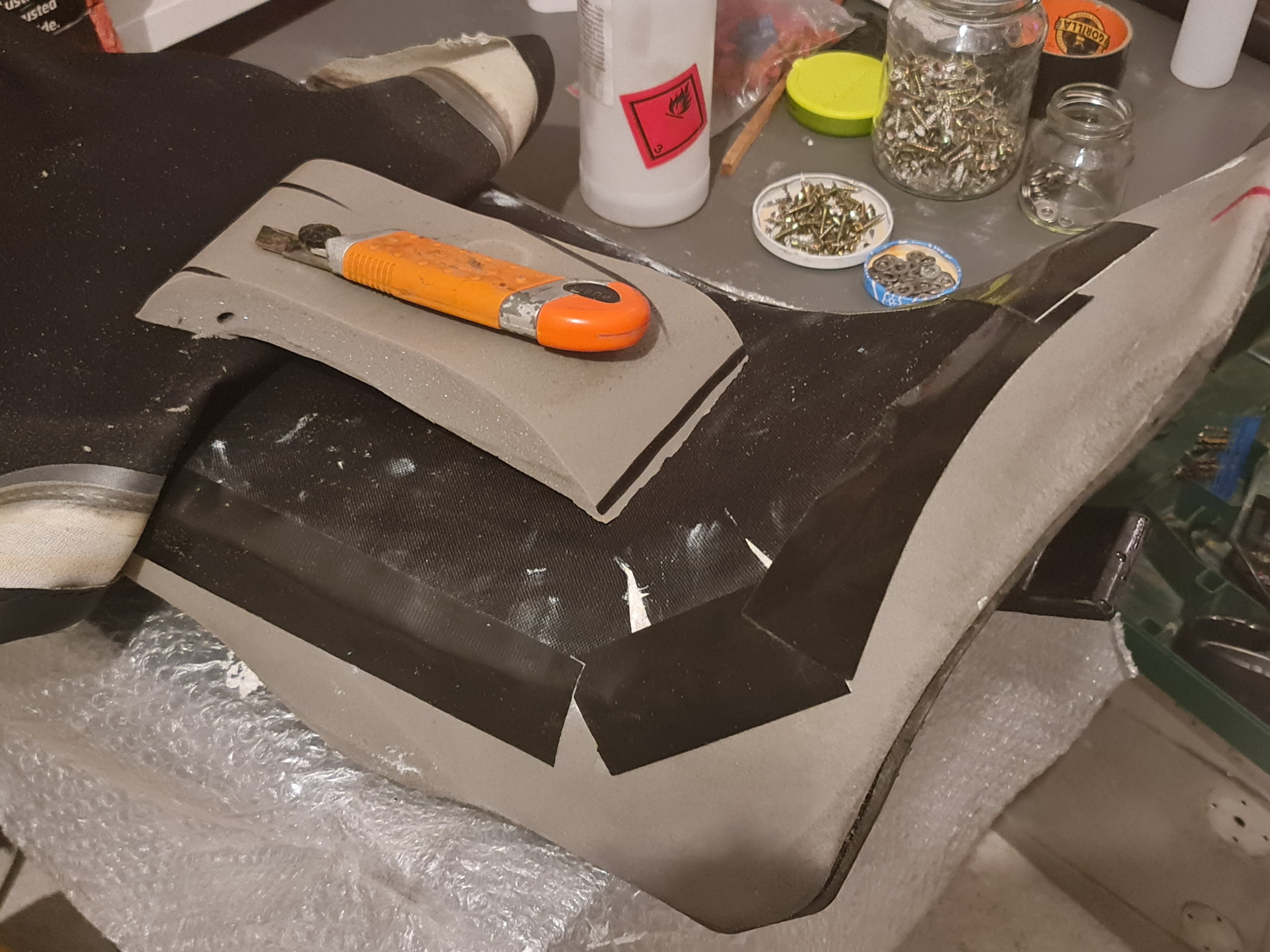 4. Wenn die Form passt, dann mit grobem Schleifpapier den Schaumstoff glaetten, ohne Druck auszuueben. Ich habe dann noch eine duenne Schicht von widerstandfaehigem Stoff mit SIKAFLEX aufgeklebt. Hatte ich aus dem Umbau meines Schiffes noch uebrig und ist wasserdicht.