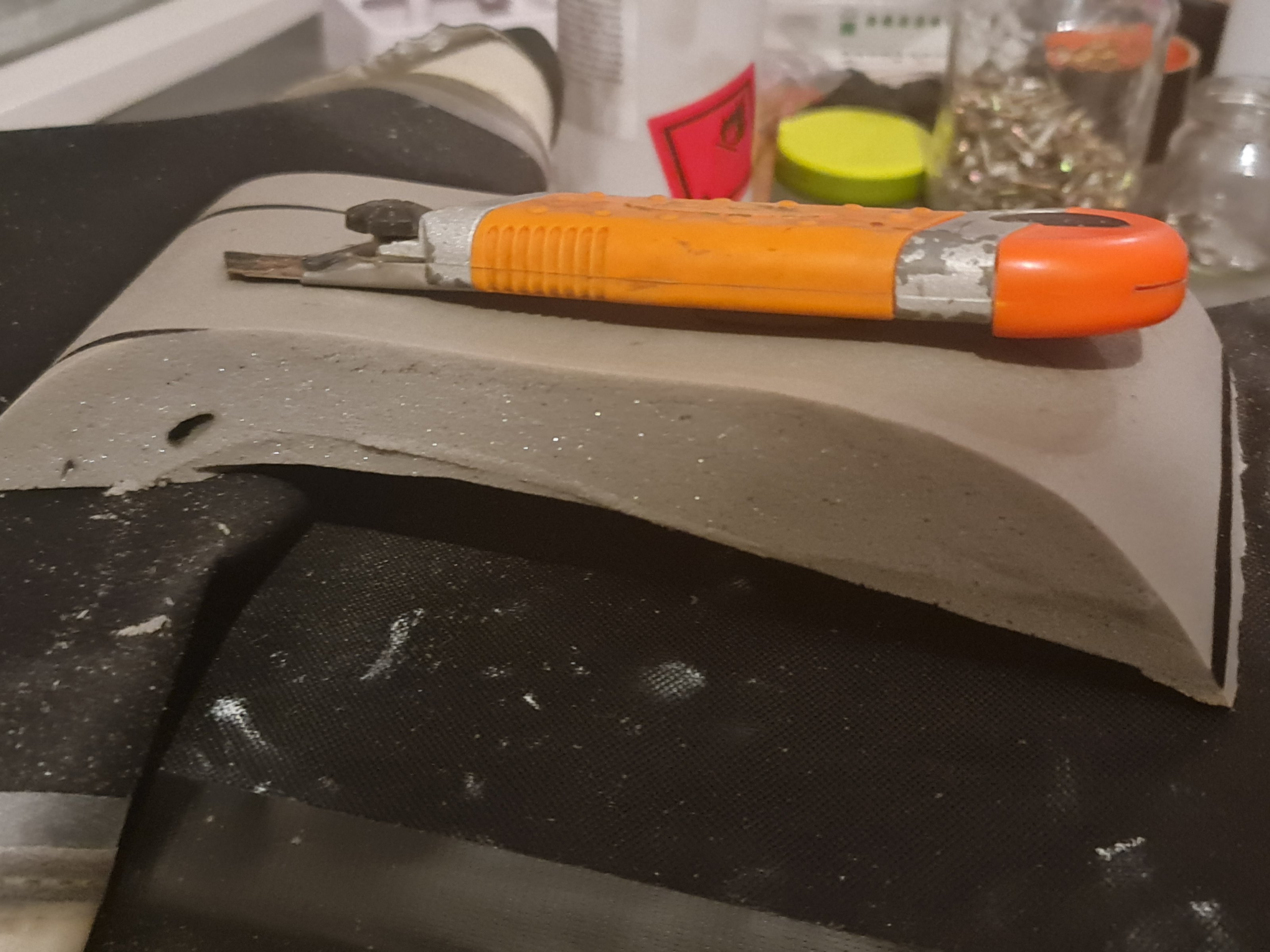 3. Sehr scharfes Messer nehmen, ich nahm ein Stanley Messer. Andere haben empfohlen elektrische Messer zu nehmen, habe ich aber nicht gebraucht. Der Schaumstoff laesst sich sehr leicht schneiden. Keinen Druck ausueben, damit es keine Verformungen gibt. Langsam und sauber schneiden bis die richtige Sitzhoehe und Form erreicht ist. Dauert seine Zeit, da ich lieber 10x schneide als 1x zu viel wegnehme.