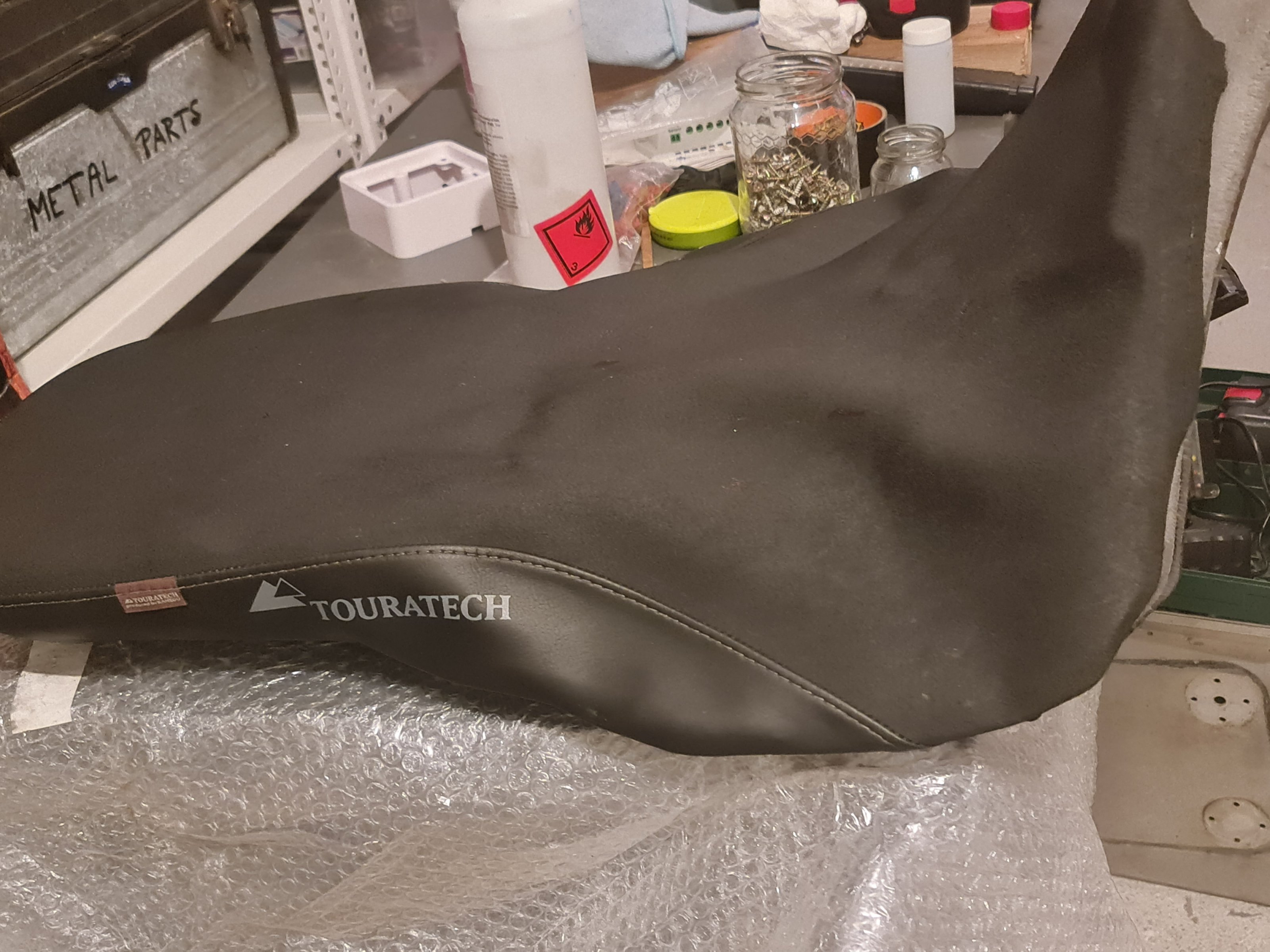 Es handelt sich zwar um den Touratech Sitz meiner Zweitmaschine, einer Yamaha XT660Z, aber der Prozess ist der gleiche bei Sitzen fuer die BMWs. Habe den Sitz 2. Hand ueber ein Forum gekauft, weil TT diese nicht mehr herstellt. War muehsam und teuer den aus den UK nach Wien zu bekommen (Zoll 70 Euro!). Als ich den Sitz montiere, merke ich, dass er viel zu hoch ist. Bin zwar hohe Maschinen gewoehnt, aber wenn ich im Stand gar nicht mehr an den Boden komme, ist das nicht sehr sicher. Also ran an die Arbeit: