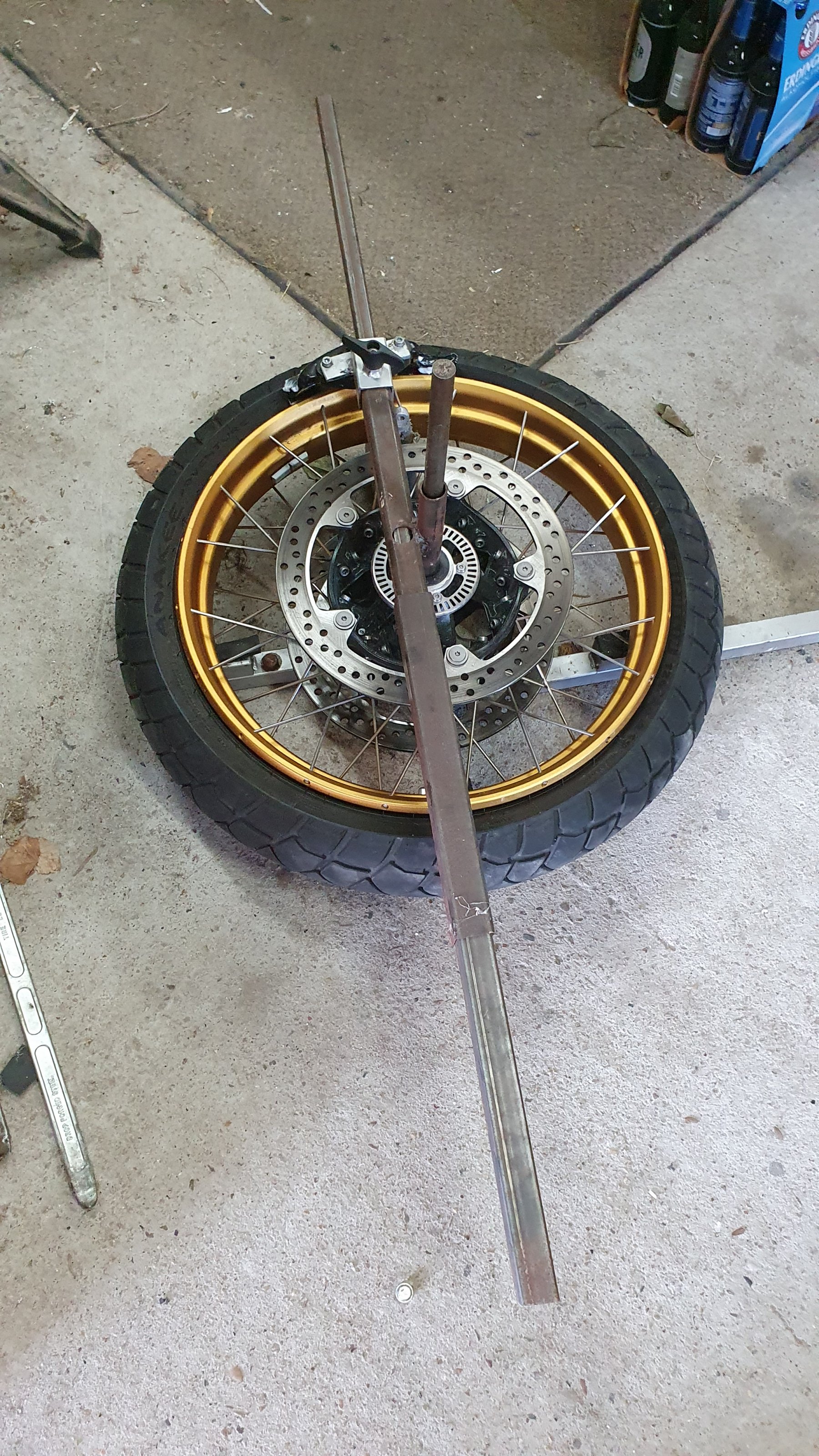 Das Abdrückblech mit der super Speziallagerung (M10er Schraube als Achse durch 11,5er Bohrungen gesteckt :grosse-augen:) habe ich zum Schrott und drück die Reifen mit einem ganz einfachen Gartenspaten (Baumarkt 8,-) per Eigengewicht ab. Man darf sich nur da drauf stellen wo das Rad aufliegt sonst kippt das, aber das geht gut und einfach.