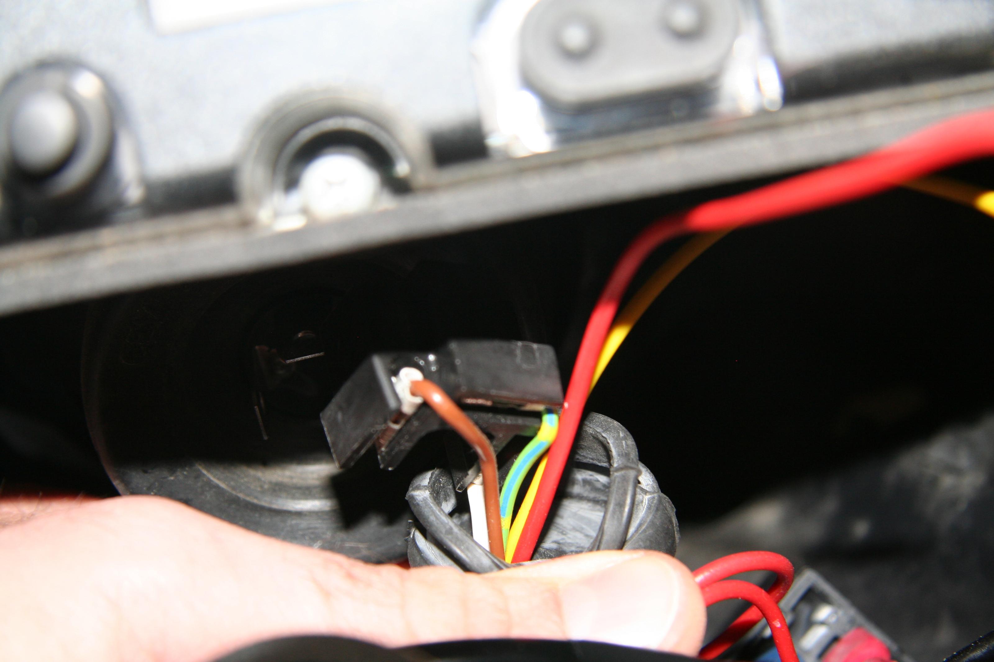 Problem: Ein weißes Kabel existiert zwar am Stecker des Hauptscheinwerfers, aber es gibt kein originales gelbes Kabel am Scheinwerferstecker, sondern nur noch ein braunes und ein grünes mit blau-gelben Strichen.