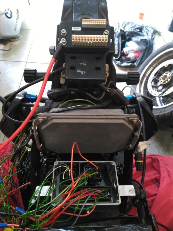 Habe heute einen wie ich finde guten Platz für die m.unit gefunden. Unterhalb der m-unit wird noch die Breakout Box montiert die Signale an den Motogadget Motoscope Pro (Tacho) weiterleitet. Für den Kraftstoff Anzeigedämpfer, die Motronic und die Sicherungen habe ich eine Alu-Box an die Stelle montierit, an der sich bei anderen das ABS befindet. Konnte gestern EINIGES vom Kabelbaum entfernen, ich hoffe nicht zuviel... Ich arbeite mich Stück für Stück voran.